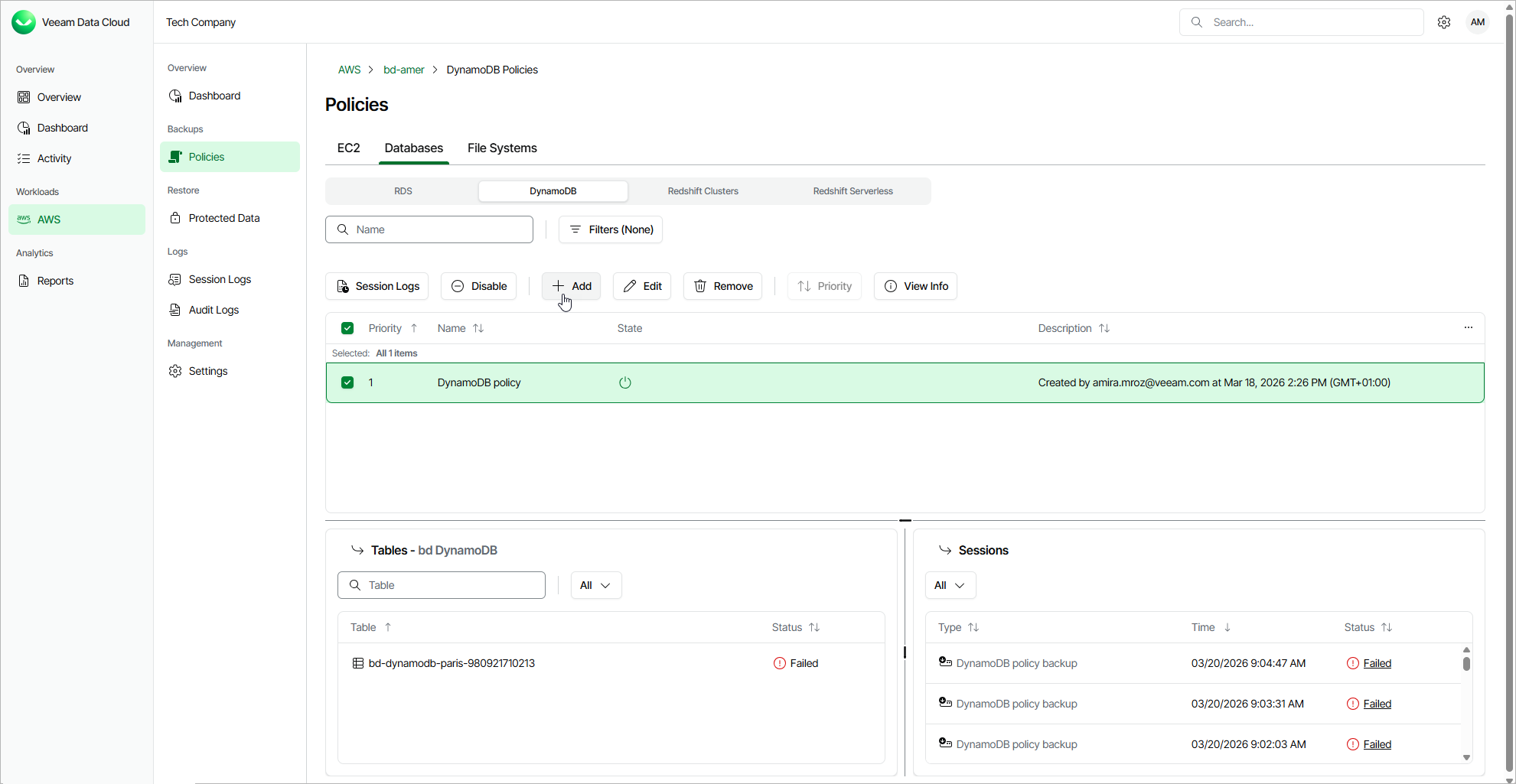 Step 1. Launch Add DynamoDB Policy Wizard To launch the Add DynamoDB Policy wizard, do the following:On the AWS page, locate a tenant that has access to resources that you want to back up, and click Manage in the Actions column.On the tenant administration page, navigate to Policies > Databases > DynamoDB and click Add.