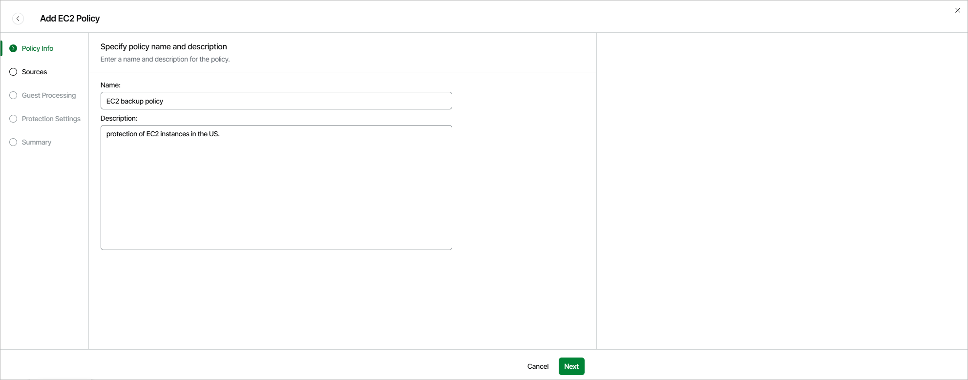 At the Policy Info step of the wizard, use the Name and Description fields to specify a name for the new backup policy and to provide a description for future reference. The name must be unique in Veeam Data Cloud for AWS; the maximum length of the name is 127 characters, the maximum length of the description is 255 characters.
