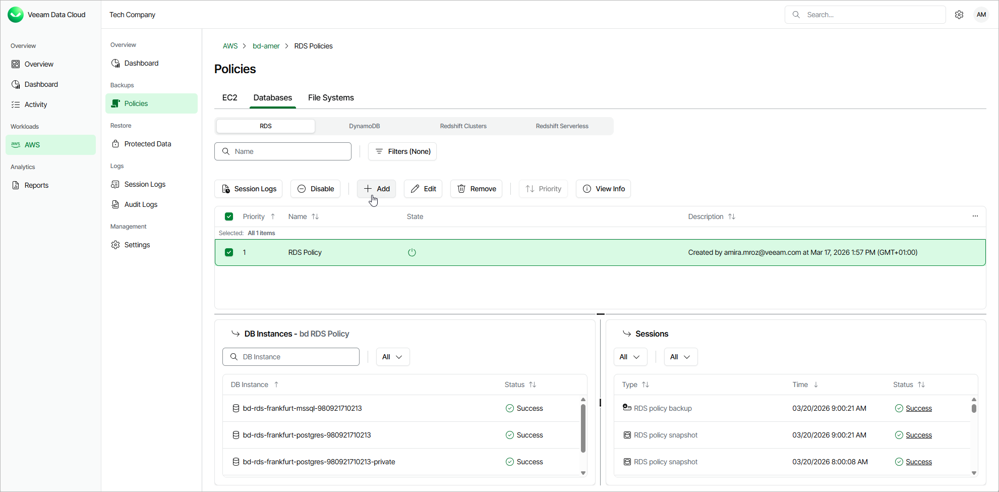 Step 1. Launch Add RDS Policy Wizard To launch the Add RDS Policy wizard, do the following:On the AWS page, locate a tenant that has access to resources that you want to back up, and click Manage in the Actions column.On the tenant administration page, navigate to Policies > Databases > RDS and click Add.