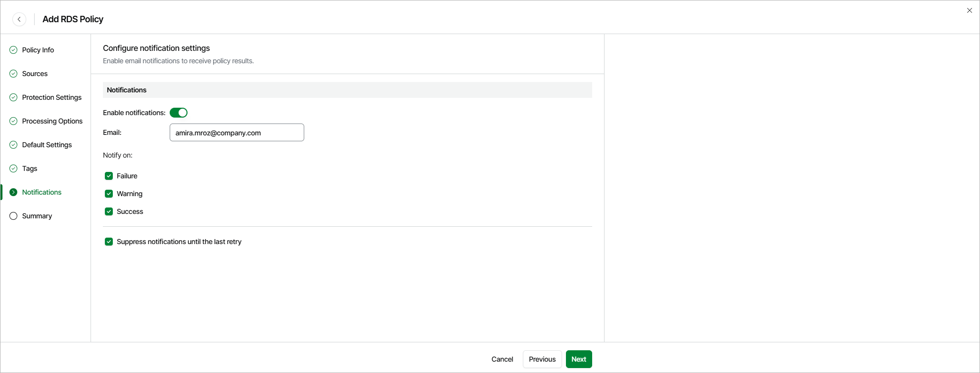 At the Notifications step of the wizard, you can instruct Veeam Data Cloud for AWS to send notifications by email in case of backup failure, success or warning. To do that, set the Enable notifications toggle to On. Then, specify an email address of a recipient in the Email field.