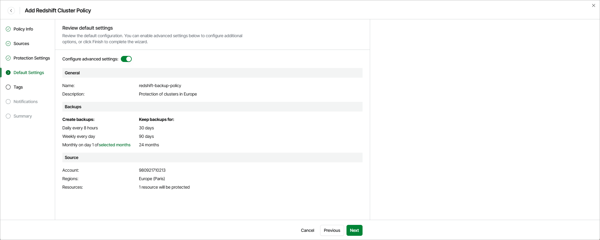- To configure additional settings (such as assigning tags to cloud-native backups and receiving backup policy results by email), set the Advanced settings toggle to On. Then, click Next.