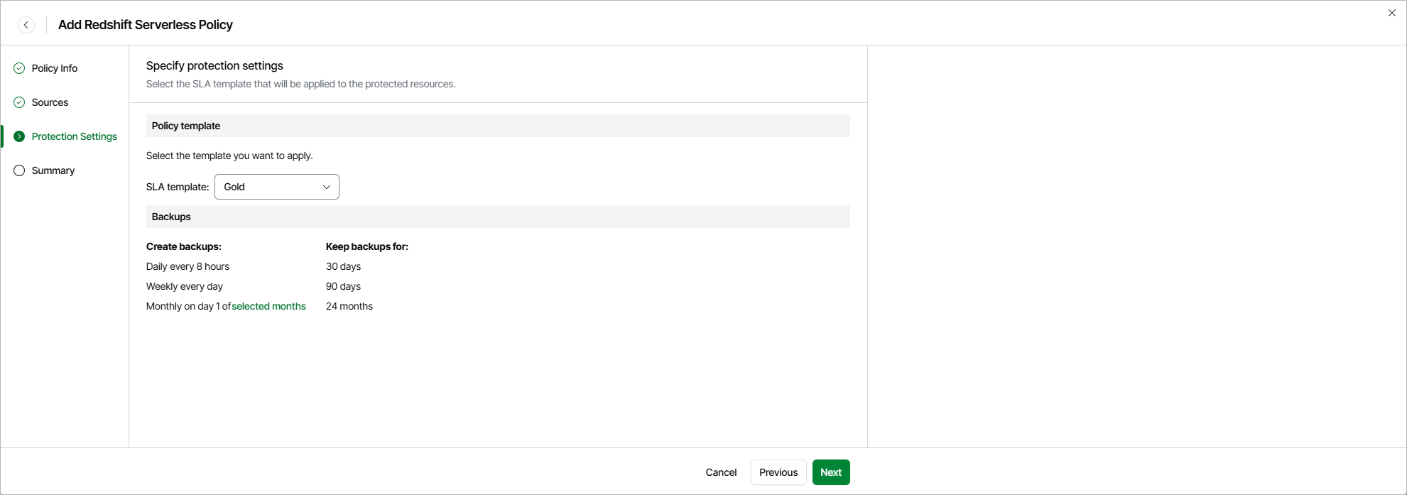 At the Protection Settings step of the wizard, select an SLA template that will be assigned to the policy and applied to the protected Redshift Serverless namespaces.