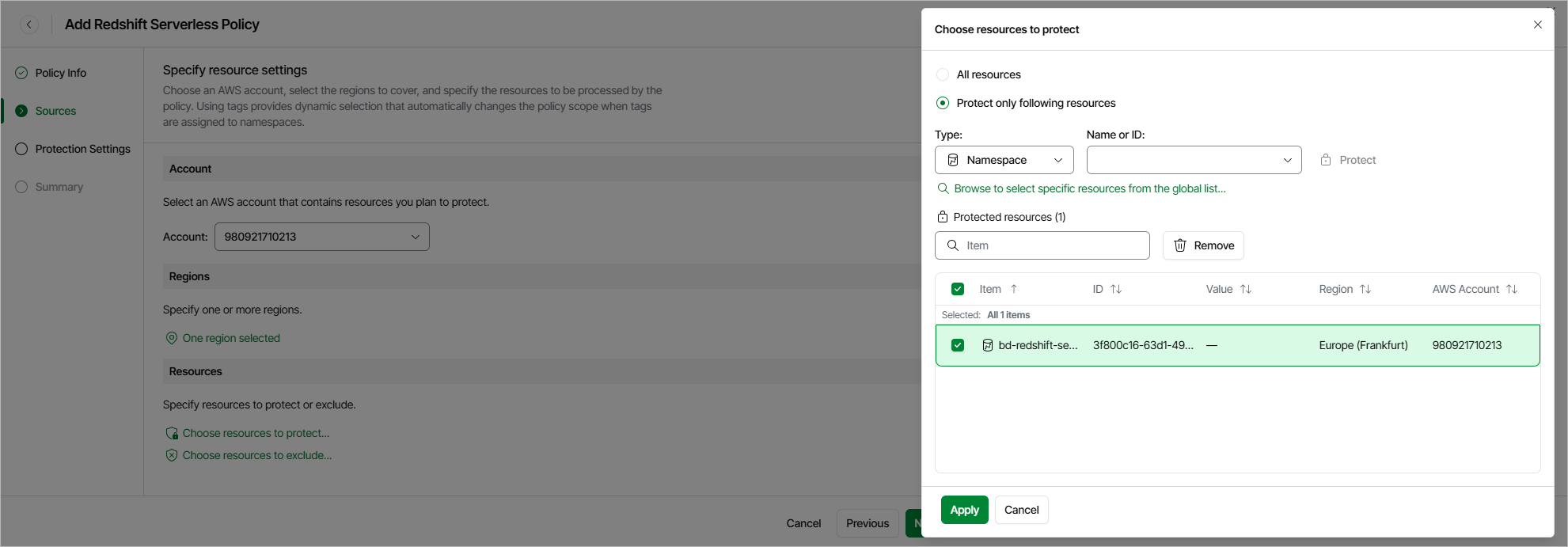At the Sources step of the wizard, select an AWS account that contains Redshift Serverless namespaces you plan to protect, specify AWS Regions where namespaces reside and choose namespaces to back up.
