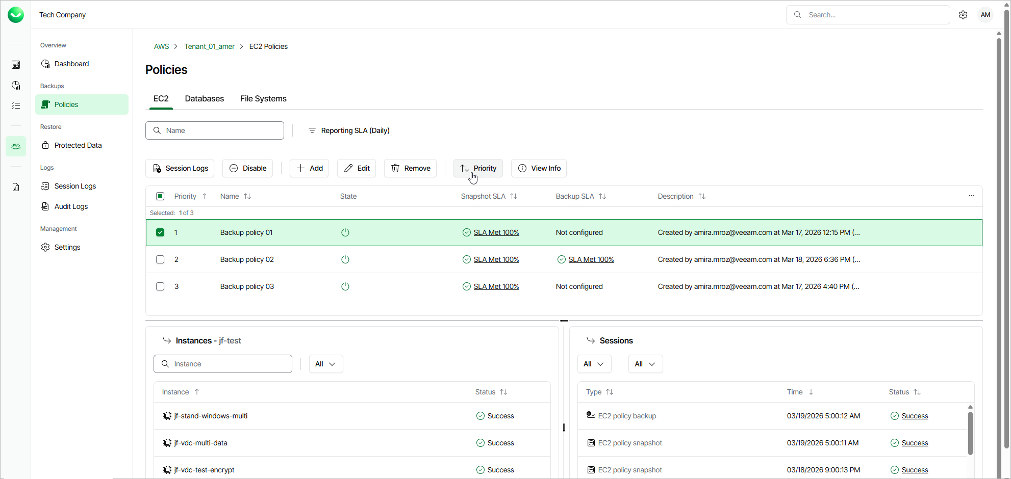 By default, Veeam Data Cloud for AWS runs backup policies in the order you create them. However, you can set the backup policy priority manually:
