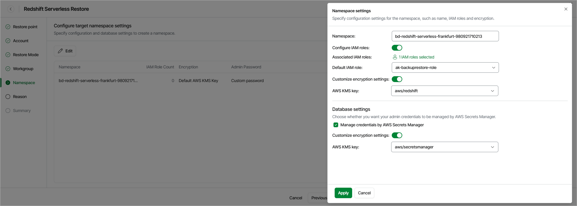 By default, the new Redshift Serverless namespace will have the same settings as the source namespace. At the Namespace step of the wizard, you can adjust these settings: