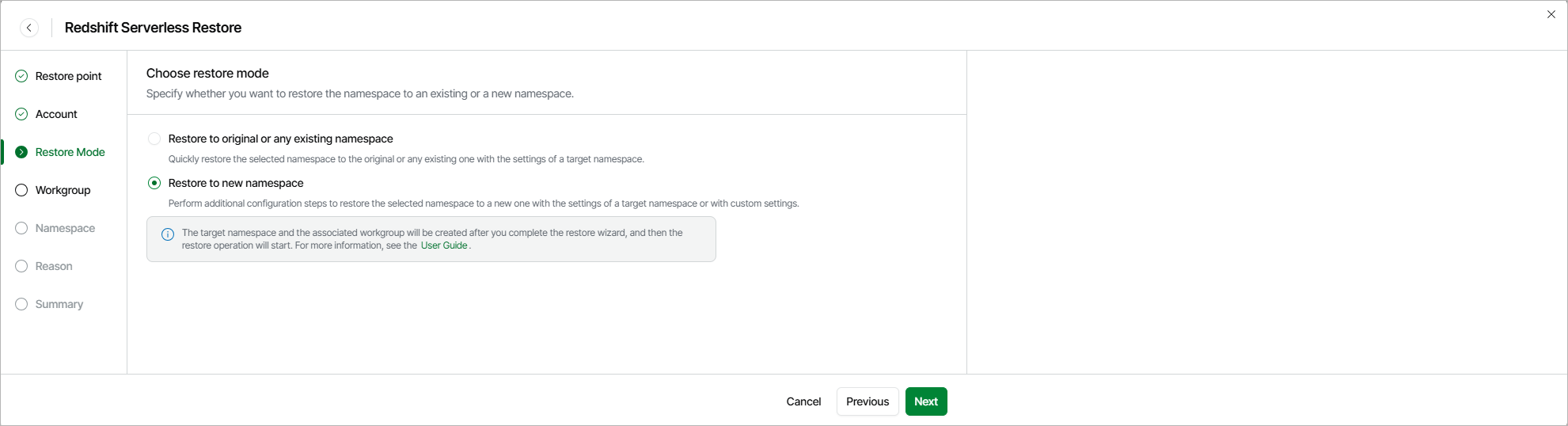 If you select the Restore to new namespace option, you will need to perform additional configuration actions at step 5 and step 6 to create the target namespace and a workgroup associated with it. The target namespace and the new workgroup will be added to the AWS infrastructure only after you complete the restore wizard, and then the restore operation will start.