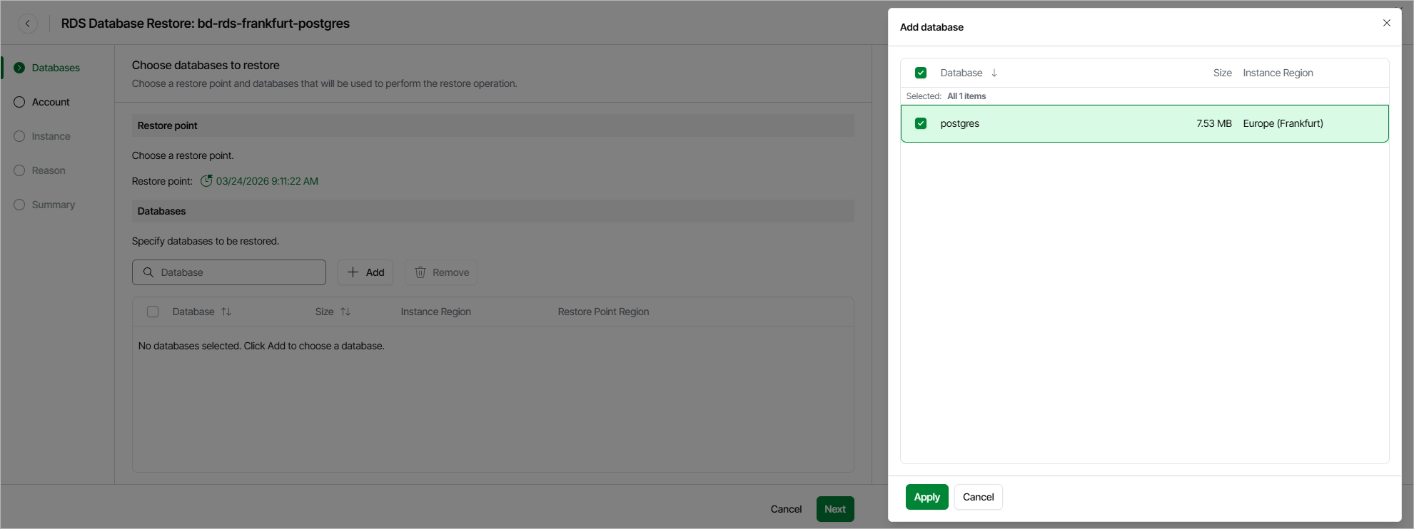 At the Databases step of the wizard, you can add databases to the restore session and select a restore point that will be used to perform the restore operation for each database. By default, Veeam Data Cloud for AWS uses the most recent valid restore point. However, you can restore the database data to an earlier state.