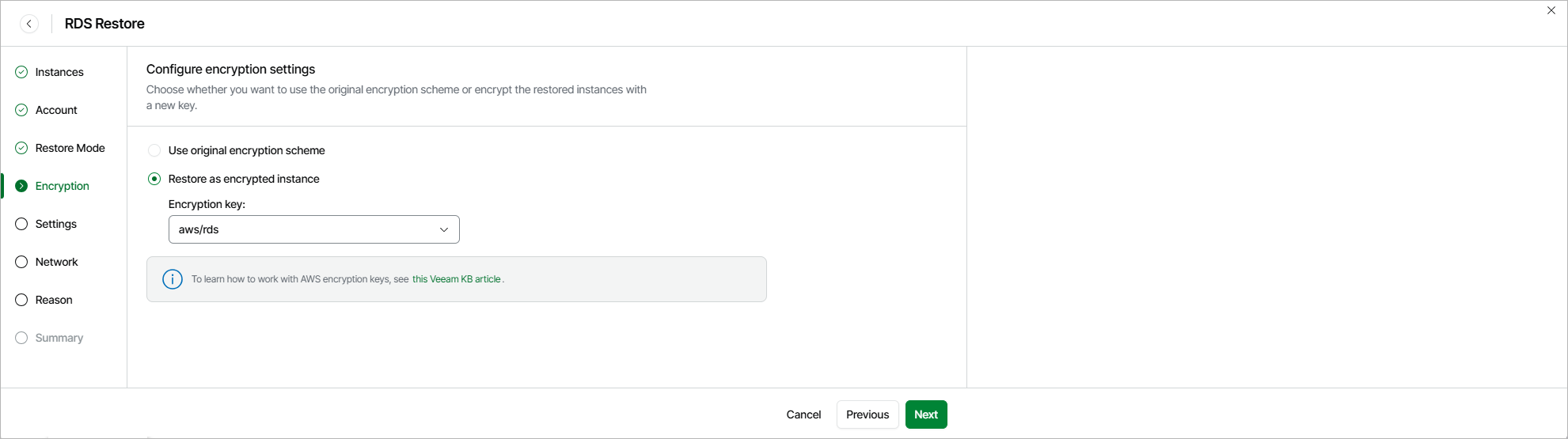 - If you want to encrypt the RDS resources, select the Restore as encrypted instance option and choose the necessary KMS key from the Encryption key list.
