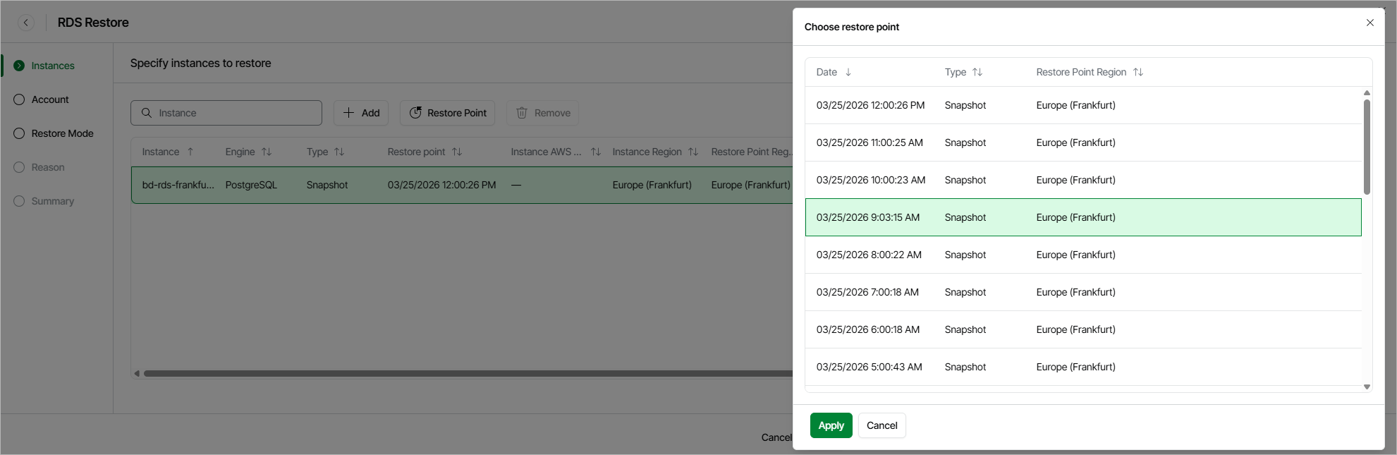 At the Instances step of the wizard, you can add DB instances and Aurora DB clusters to the restore session and select restore points to be used to perform restore for each added RDS resource. By default, Veeam Data Cloud for AWS uses the most recent valid restore point. However, you can restore an RDS resource to an earlier state.