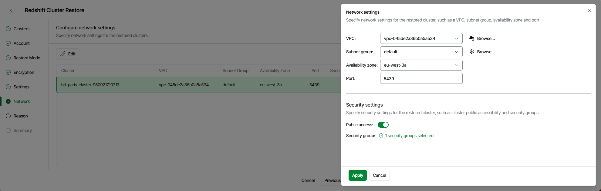 At the Network step of the wizard, configure network and security settings for the restored Redshift cluster. To do that, select the necessary cluster and click Edit. In the opened window, do the following: