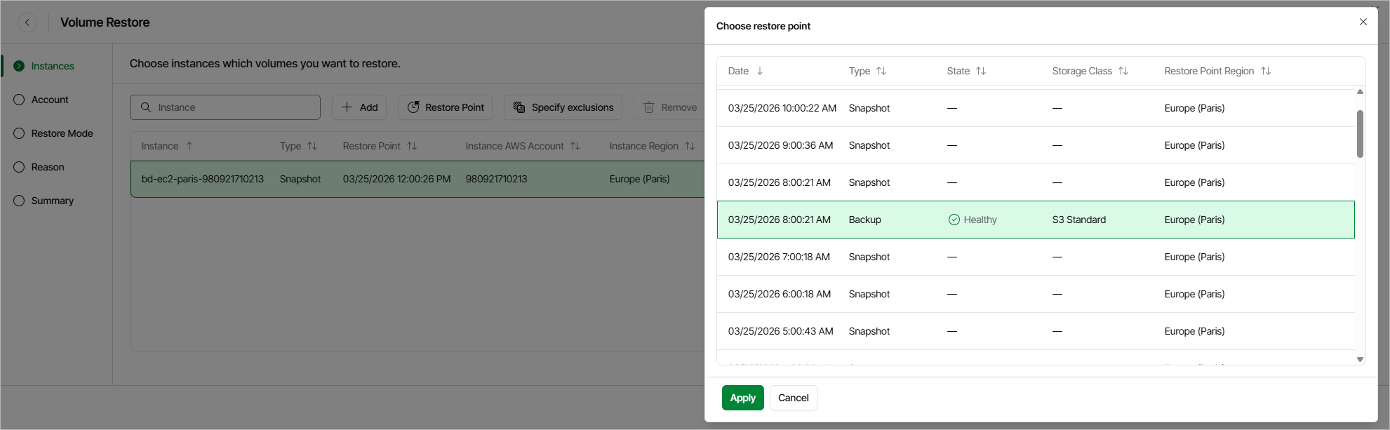 At the Instances step of the wizard, you can add EC2 instances to the restore session and select restore points to be used to perform the restore operation for each added instance. By default, Veeam Data Cloud for AWS uses the most recent valid restore point. However, you can restore EBS volumes to an earlier state.