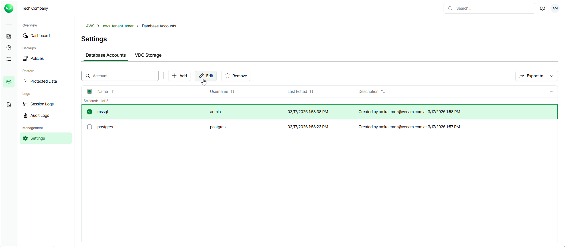 For each database account added to Veeam Data Cloud for AWS, you can modify settings configured while adding the account: