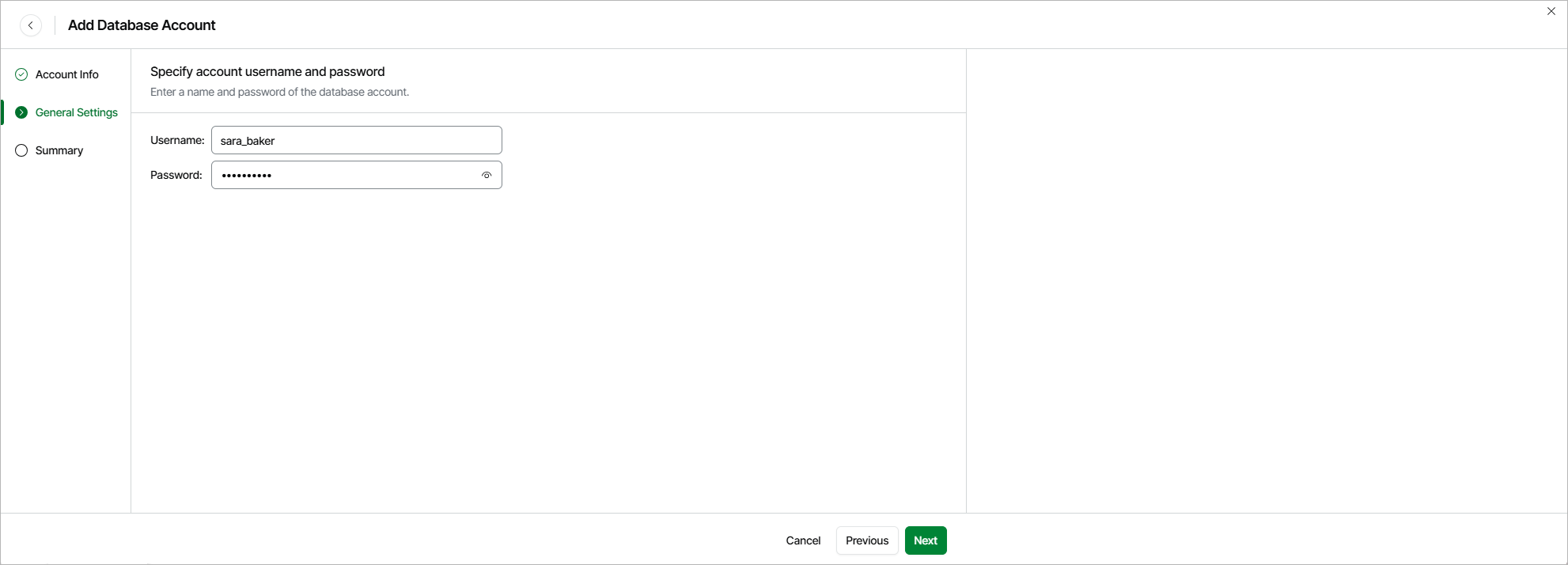 Step 3. Specify General Settings At the General Settings step of the wizard, specify credentials that the account will use to access databases protected by backup policies.