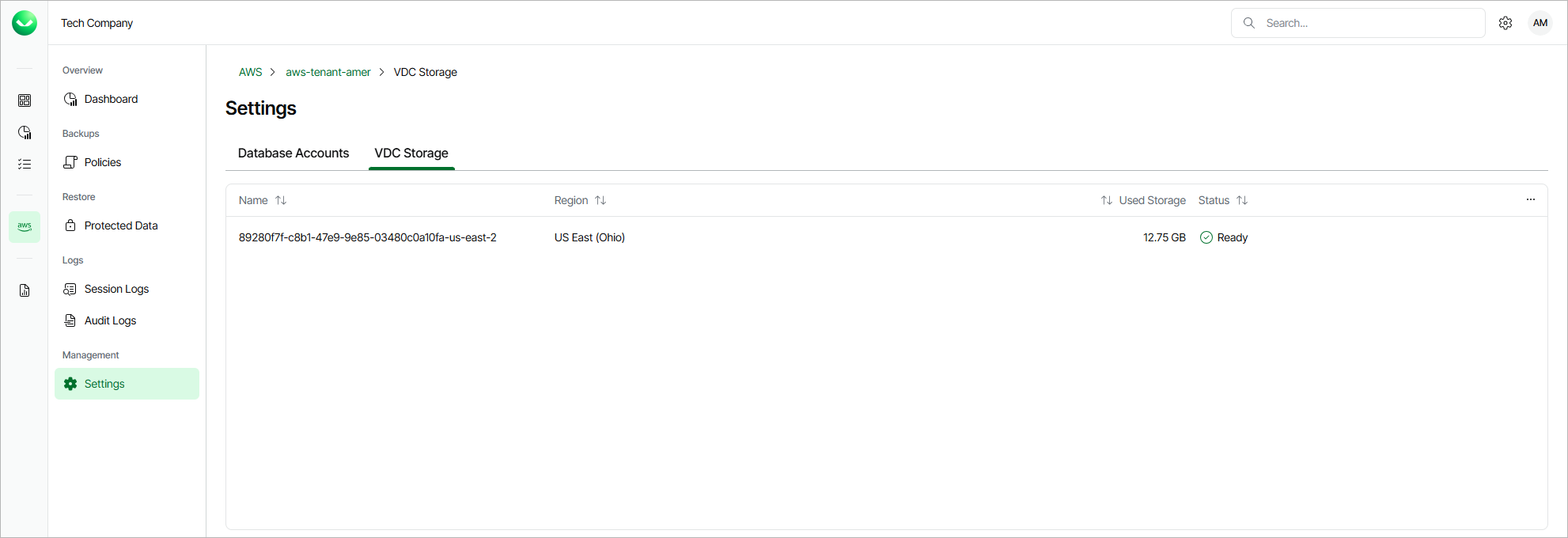 - On the AWS page, locate a tenant that has access to resources you backed up, and click Manage in the Actions column.