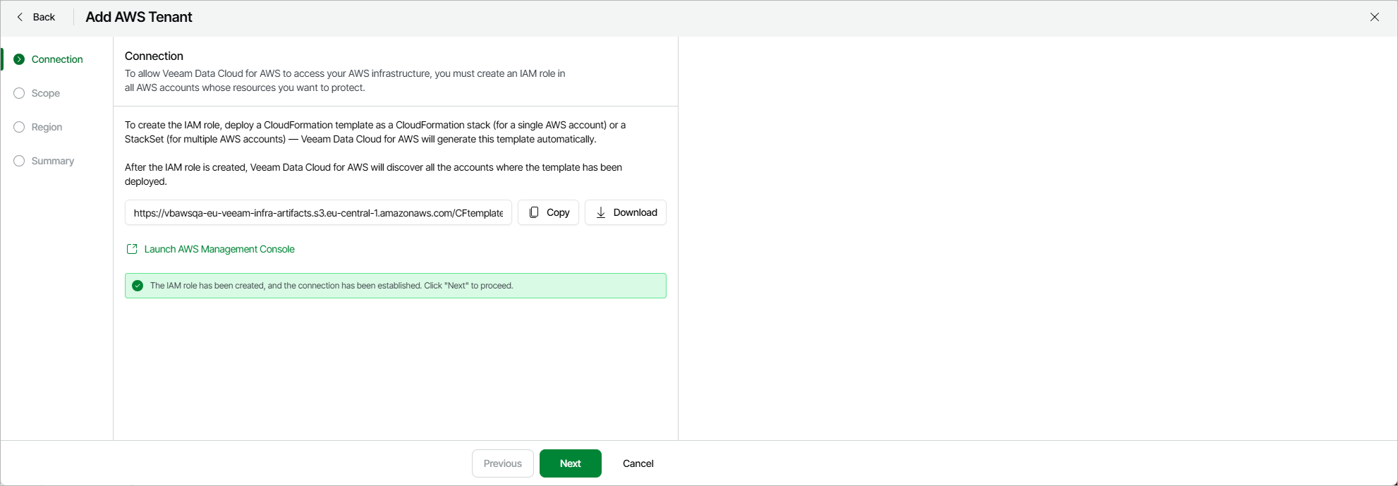 At the Connection step of the wizard, Veeam Data Cloud for AWS allows you to choose whether you want to manually copy the template URL or to export the template in the CFORM format. In the latter case, Veeam Data Cloud for AWS will save the template as a single file to the default download directory on the local machine.