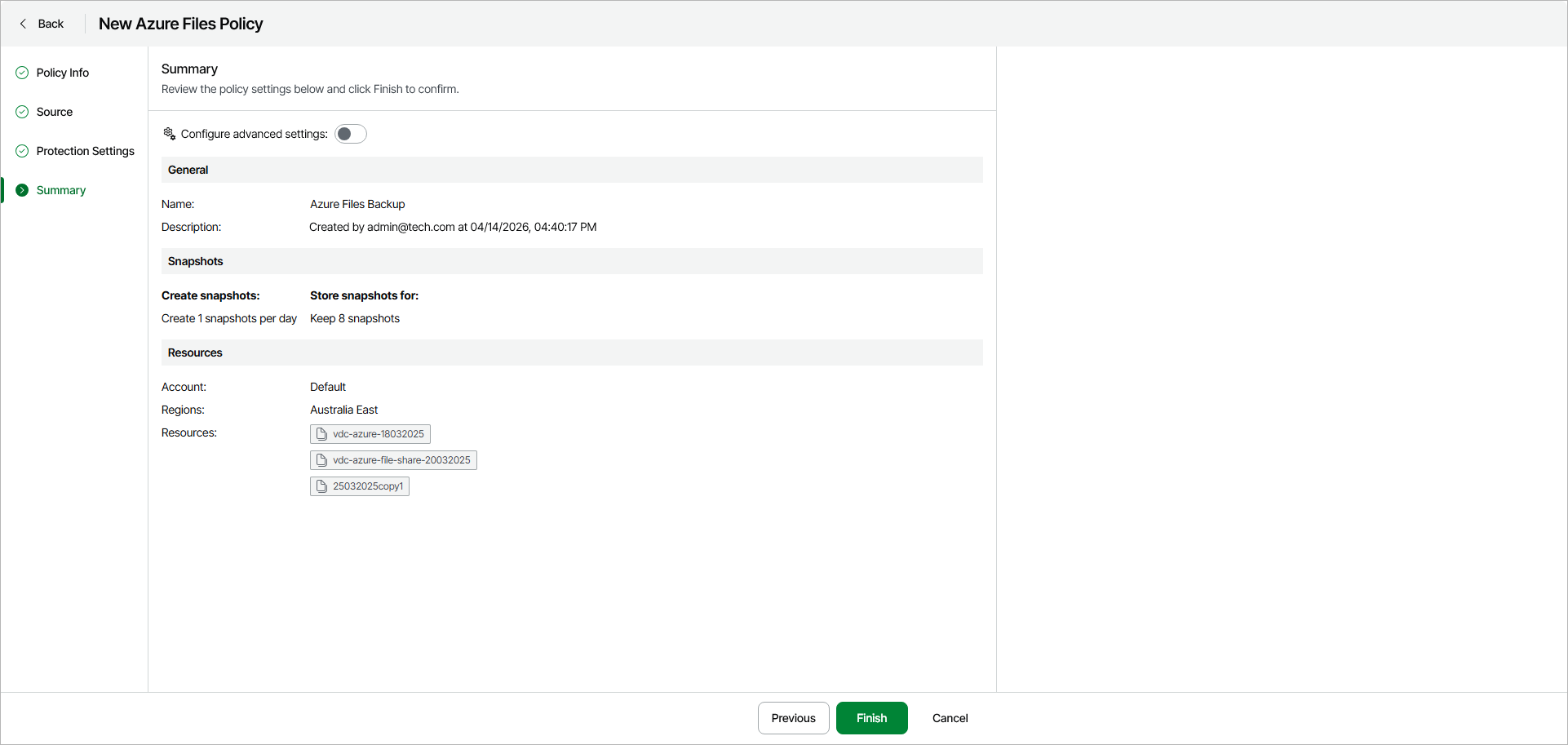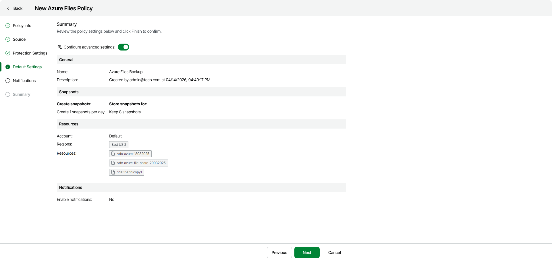 - To configure additional settings for the policy, turn on the Configure advanced settings toggle — in this case, the step name will change to Default Settings — and click Next.