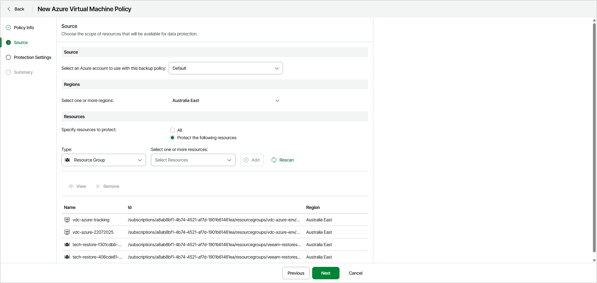 At the Source step of the wizard, specify an Azure account, region and resources to back up:
