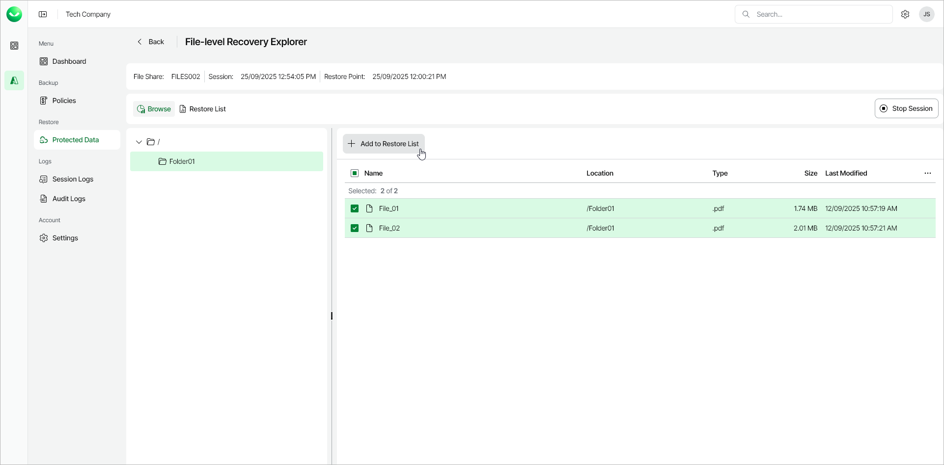 In the File-Level Recovery Explorer, you can browse and recover files and folders of the selected Azure Files share. All restored items will be saved to the specified target file share.