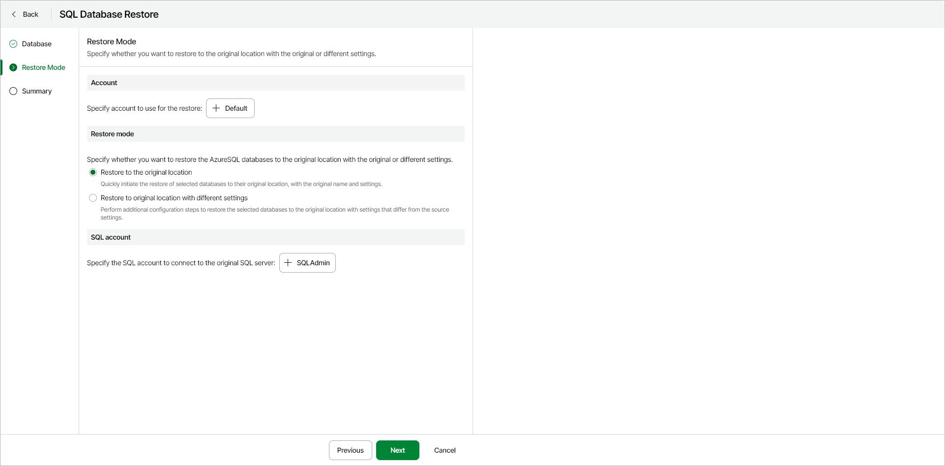 - Restore to the original location — select this option to restore an Azure SQL database with the original name and settings. If you choose this option, you must also specify an Azure SQL account that will be used to access the restored database. To do this, in the SQL Account section, click Select account and choose the necessary SQL account.