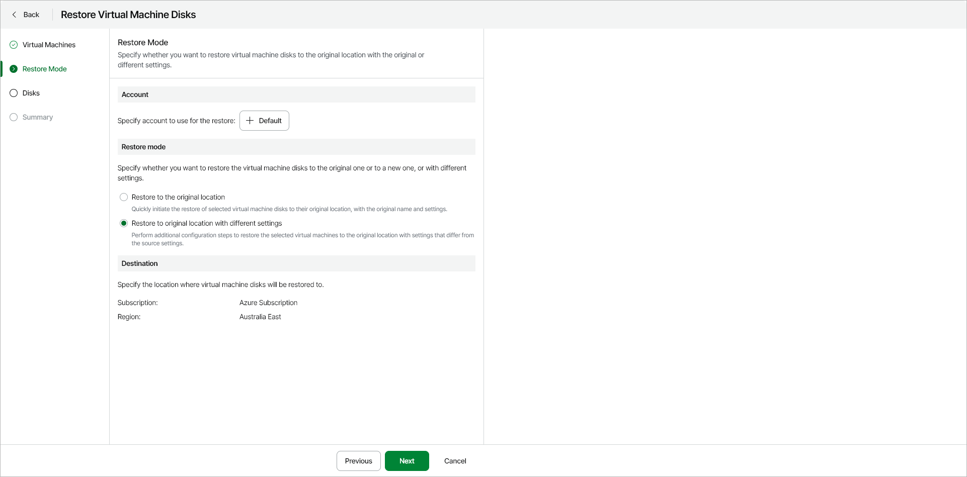 At the Restore Mode step of the wizard, specify the following restore settings: