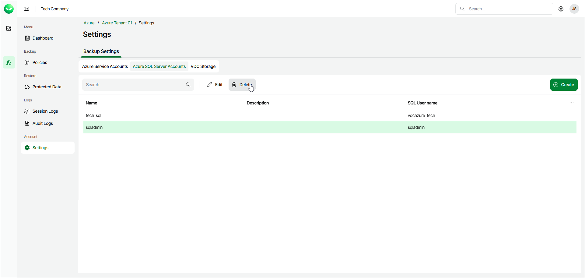 To delete a SQL server account from Veeam Data Cloud for Microsoft Azure, do the following: