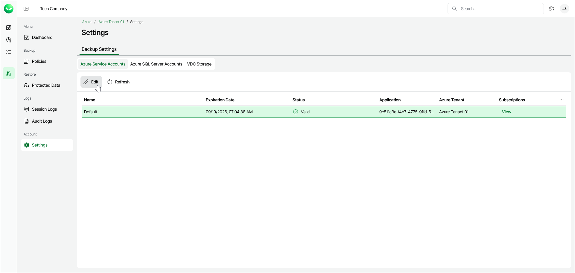 - On the Azure Service Accounts tab, select a service account and click Edit.