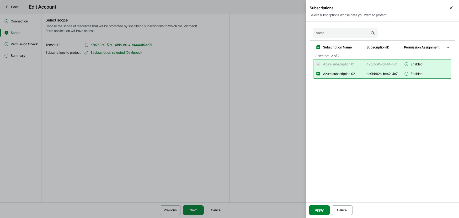 - In the Subscriptions window, select the subscription that you would like to add to the protection scope, and click Apply.