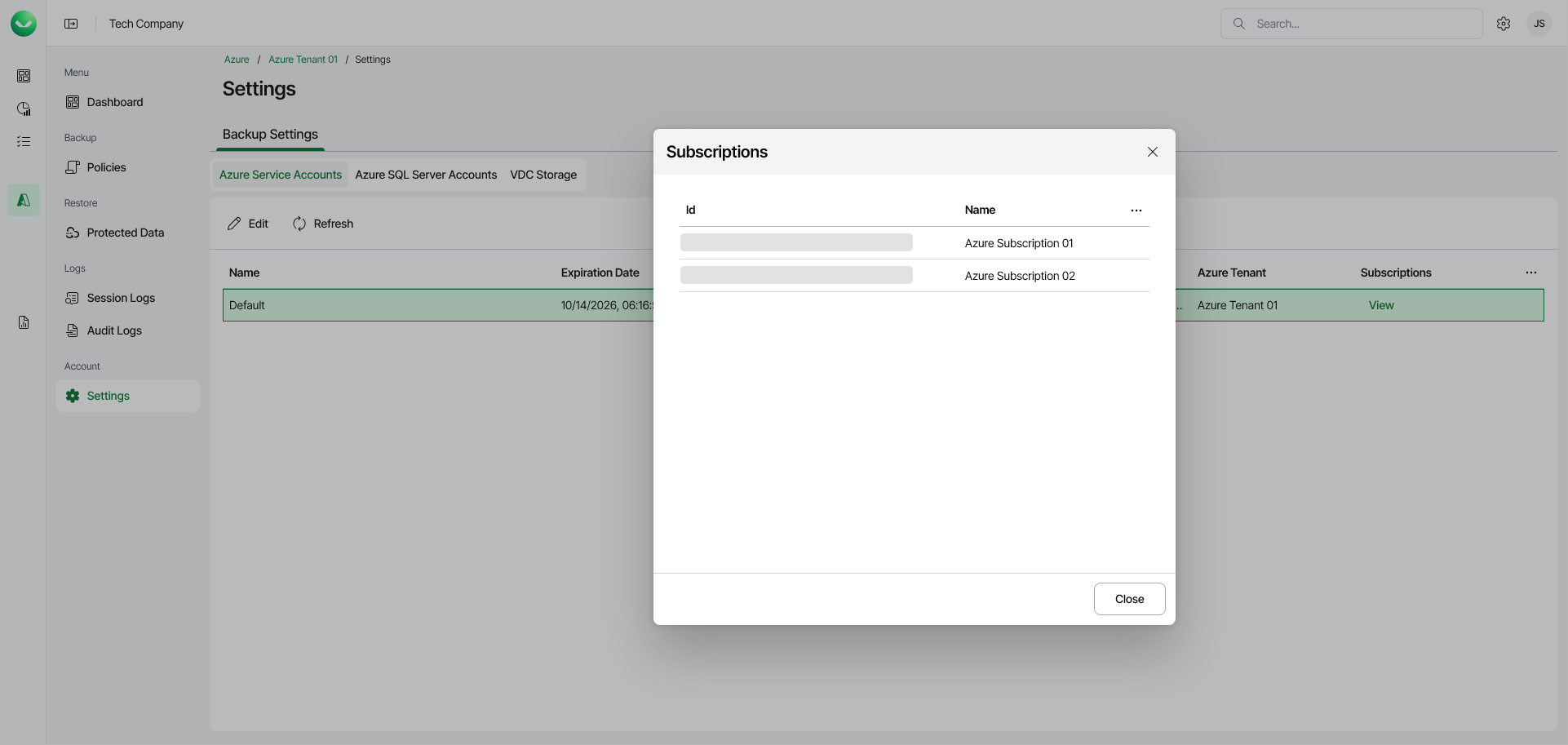 Viewing Azure Service Accounts To view information about the service account that has access to Azure resources, select Azure Service Accounts. Click View to see the list of enabled subscriptions.