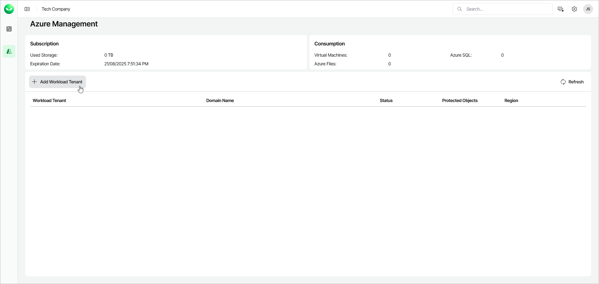 Step 1. Launch Add Azure Tenant Wizard To launch the Add Azure Tenant wizard, on the Azure Management page, click Add Workload Tenant.