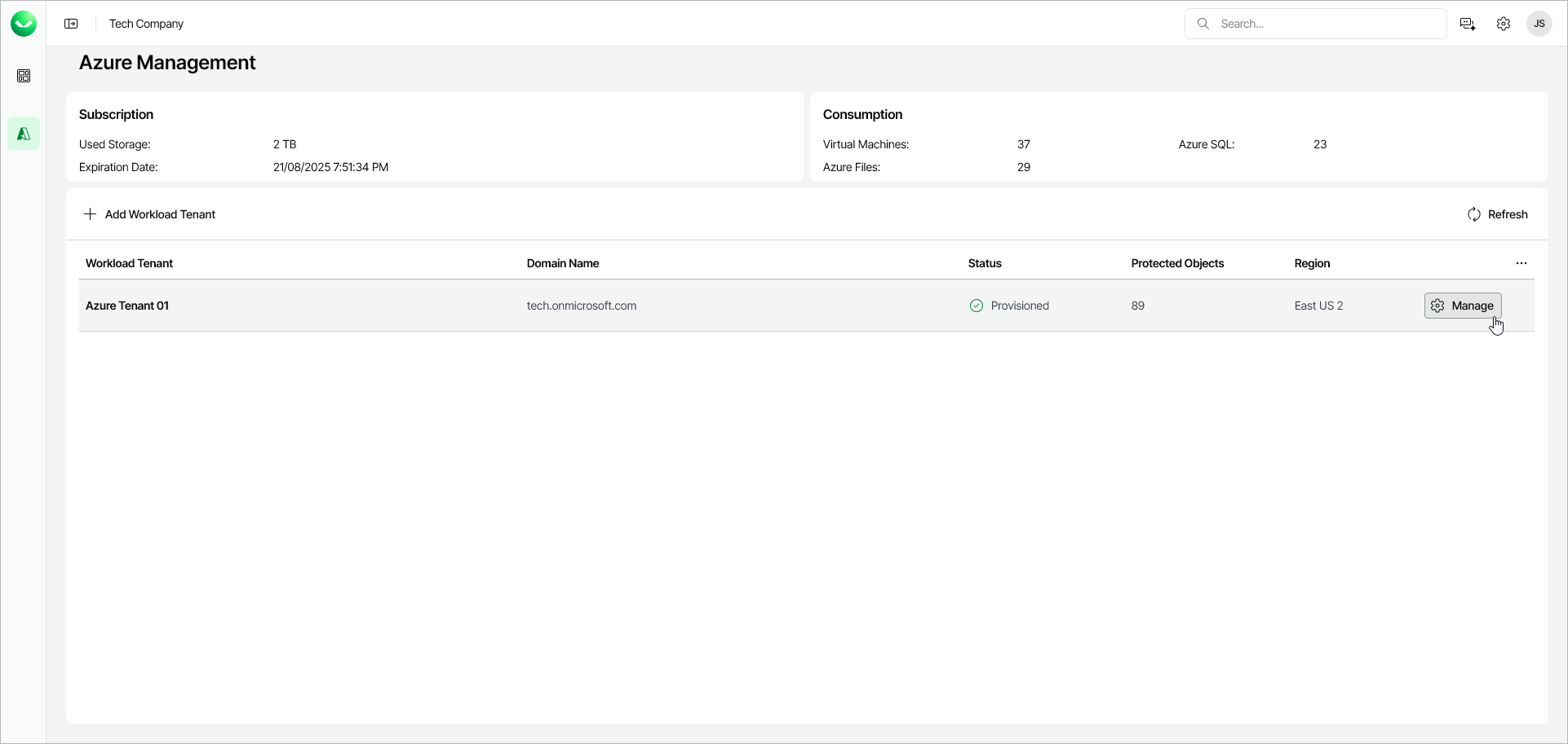 - Click Manage to open the Dashboard page. To learn more about the tenant dashboard, see Viewing Dashboard.