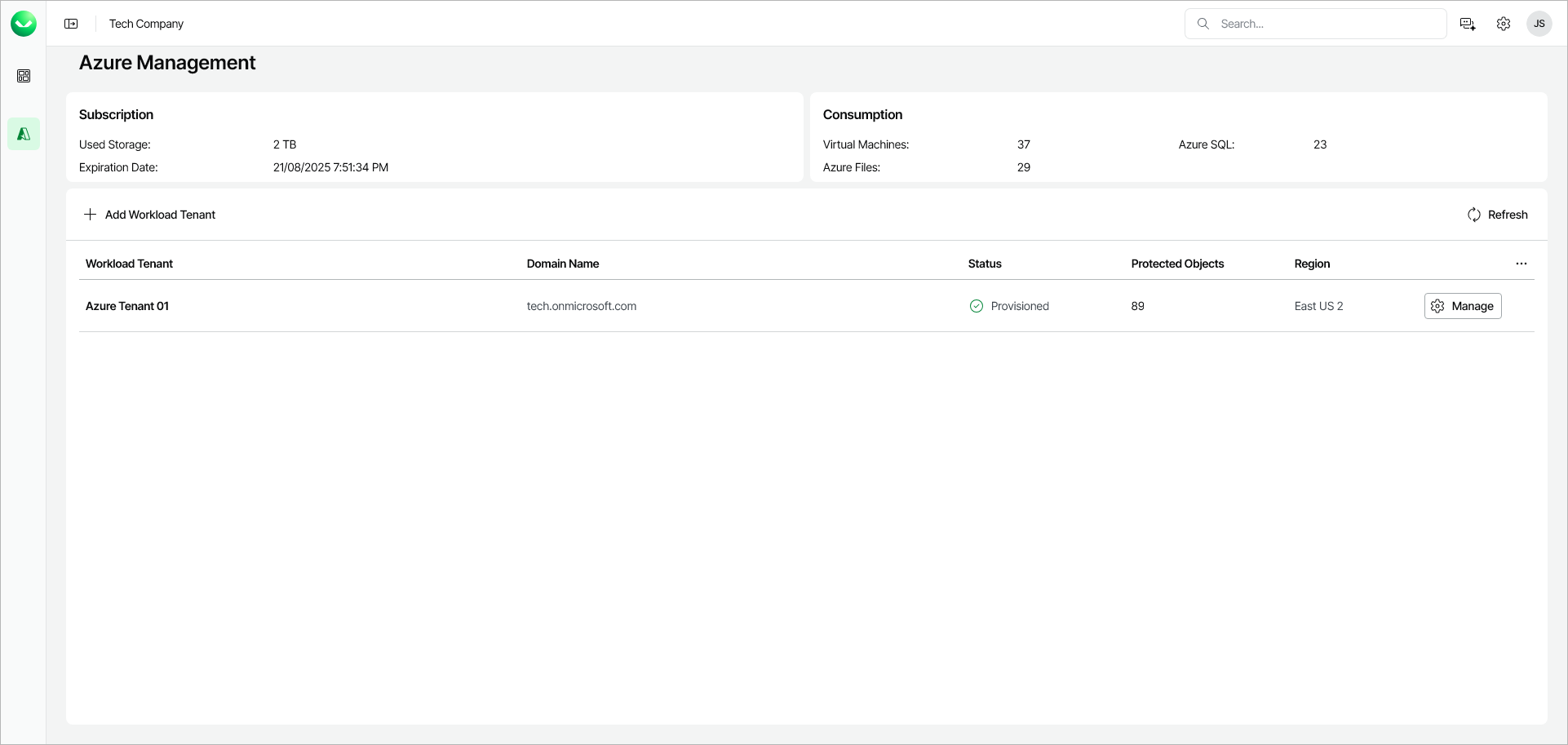 The Azure Management page provides an overview of your Veeam Data Cloud for Microsoft Azure subscription and backup storage consumption, as well as workload tenants.