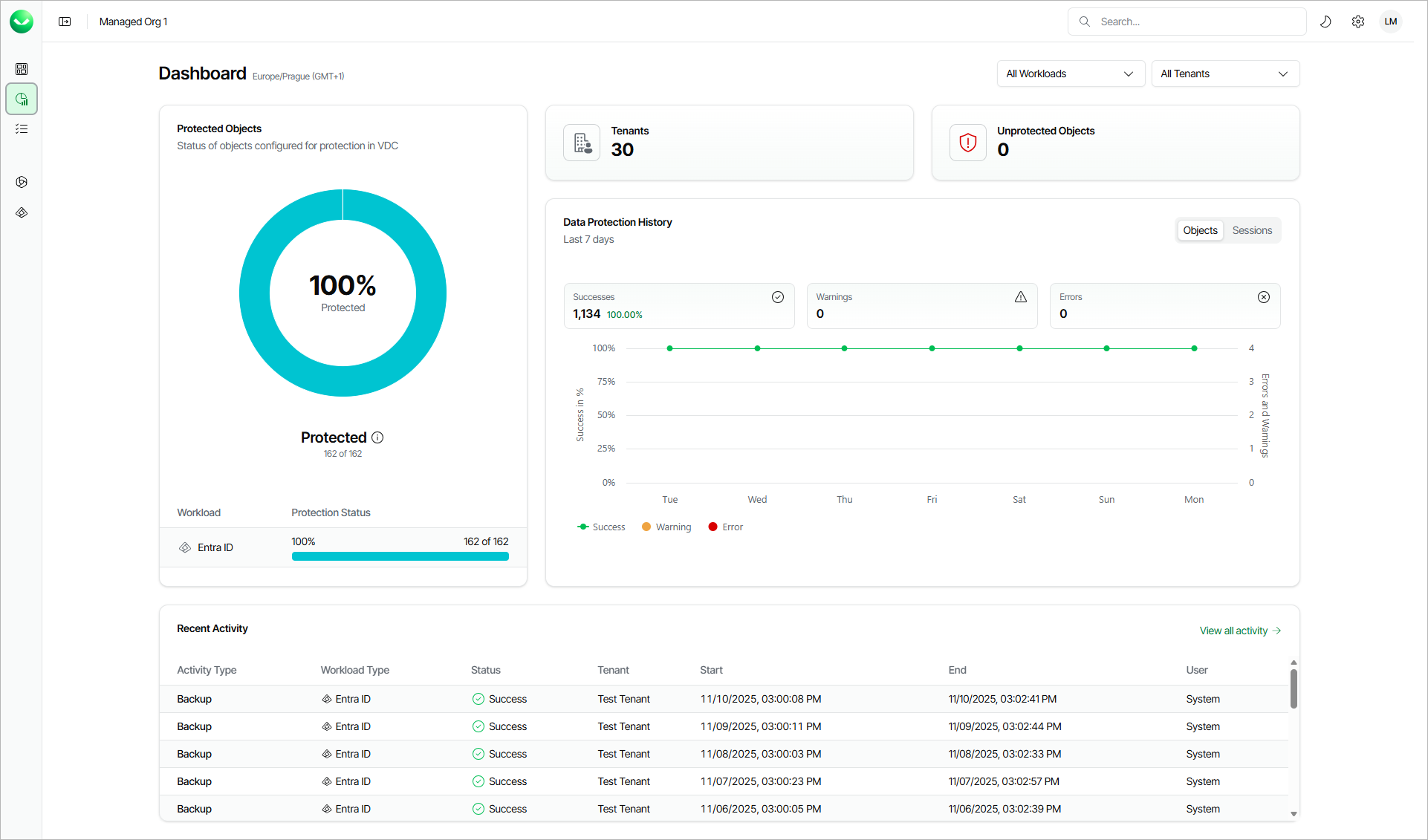 The organization dashboard provides a centralized view for monitoring data protection across all workloads in your Veeam Data Cloud organization without the need to access the individual tenants management. The Dashboard page contains information about tenant protection status, the number of protected objects and the recent backup sessions.
