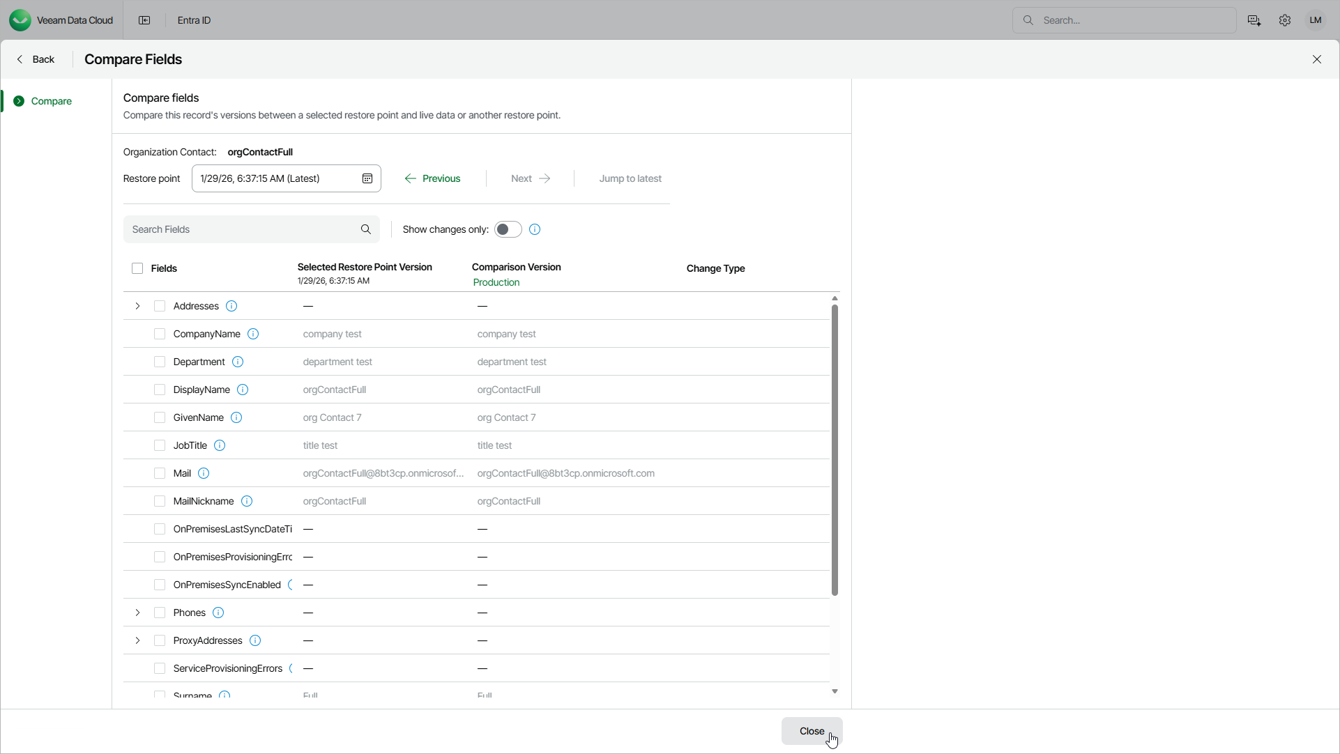 You can compare the property values of a Microsoft Entra ID organization contact in a selected restore point with the values in production or in another restore point. Comparing contact properties helps you identify which properties were modified and review the changes before exporting the organization contact. You can export organization contacts to JSON files for further import or restore into Microsoft Entra ID or compatible systems. For details on export, see Entra ID Object Export.
