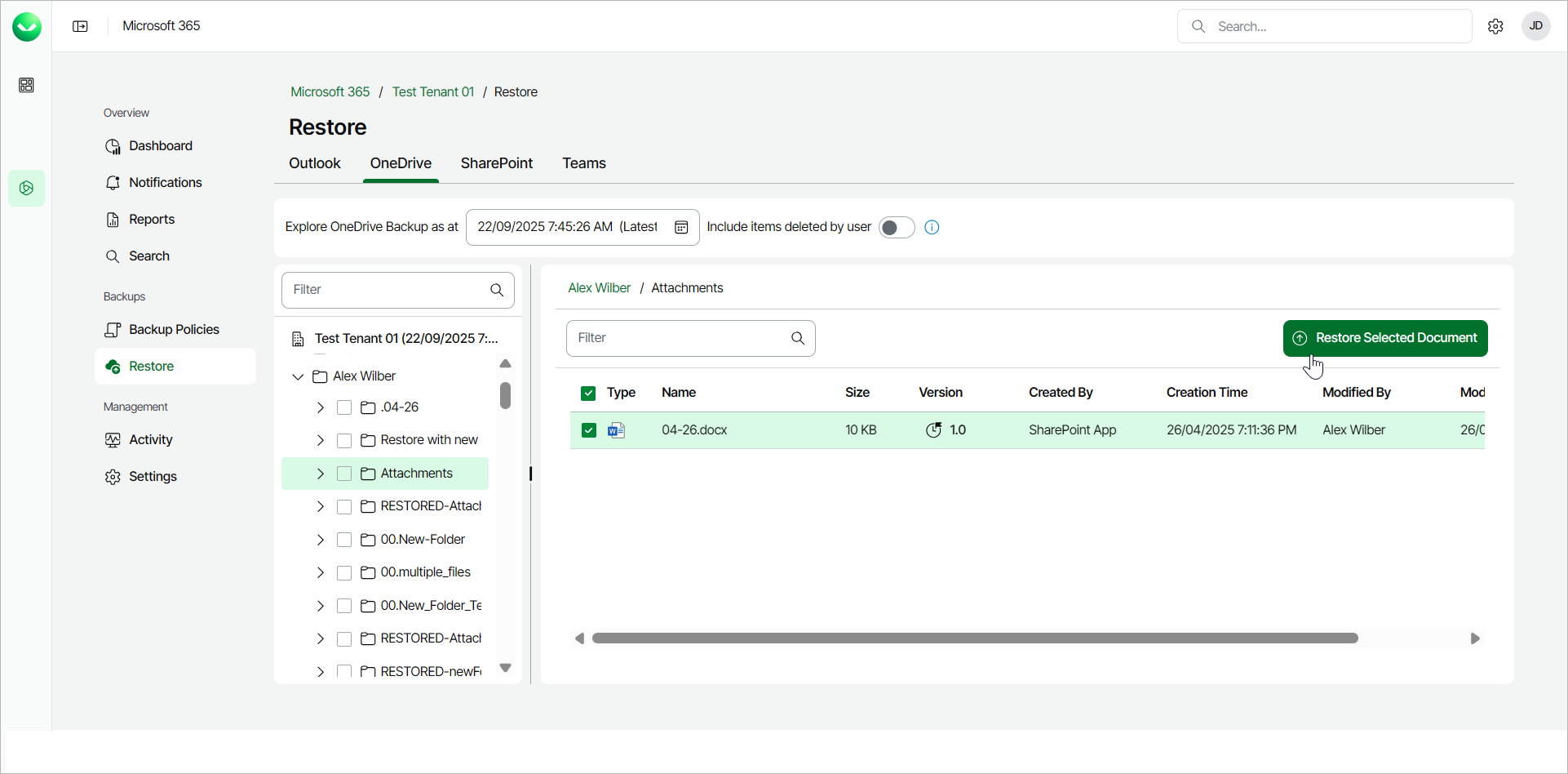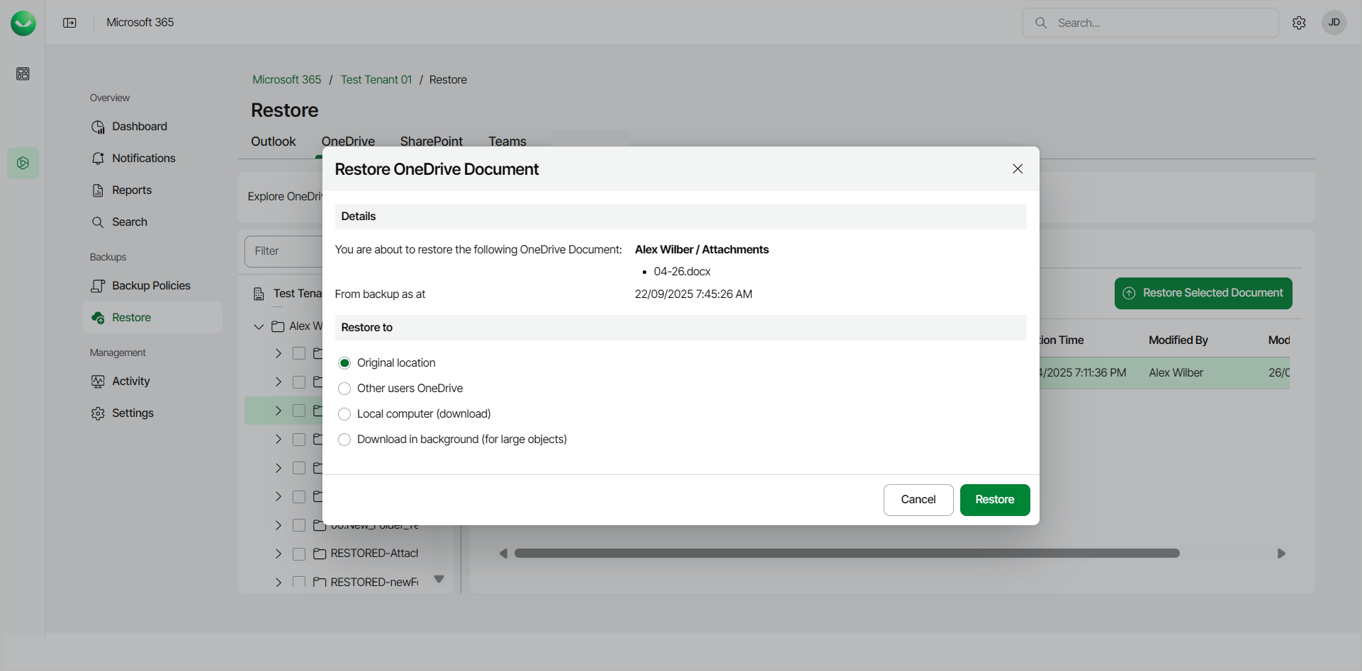 - In the Restore OneDrive Document window, check the name of the user account, folder and document you want to restore, and the time when the backup that contains the document was created.