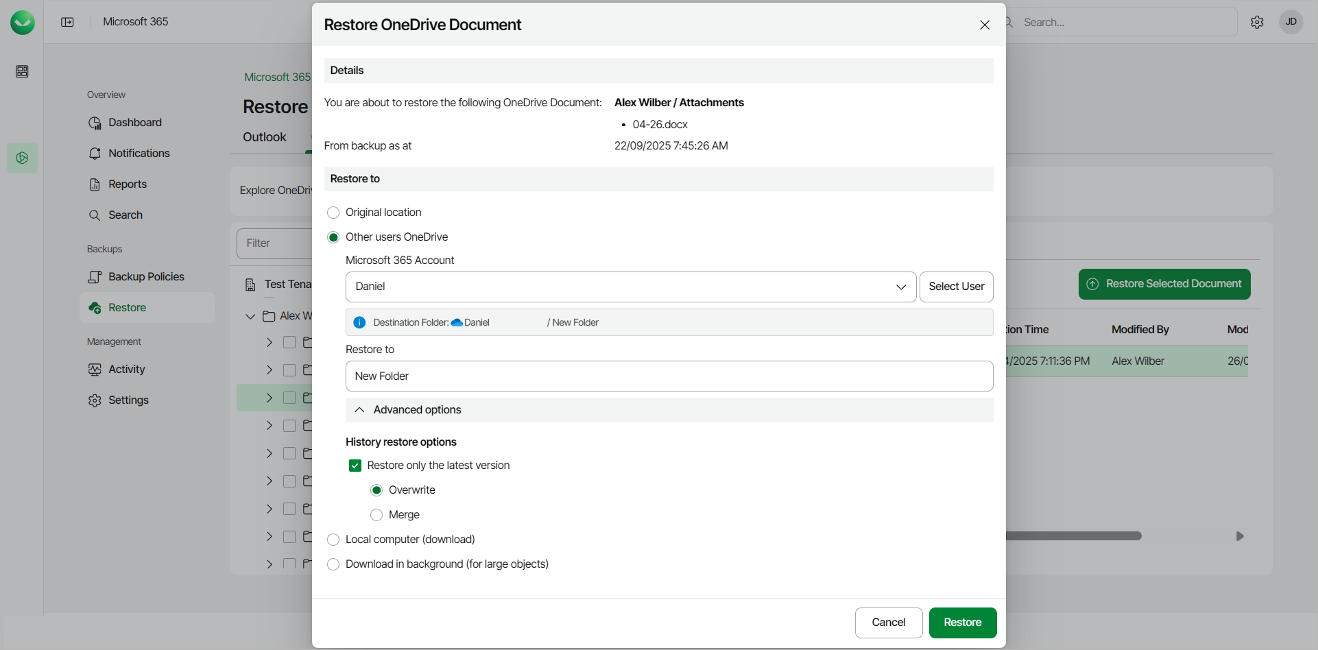 - Other users OneDrive. Select this option if you want to restore the OneDrive document to OneDrive of another Microsoft 365 user.