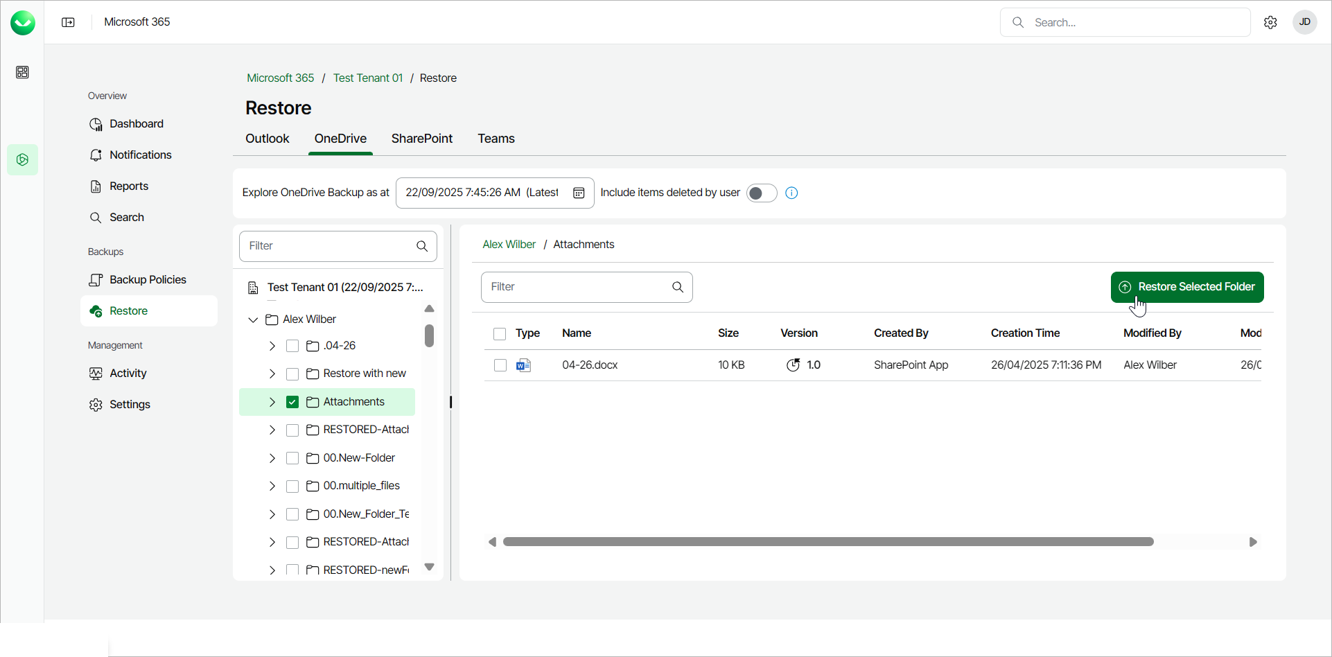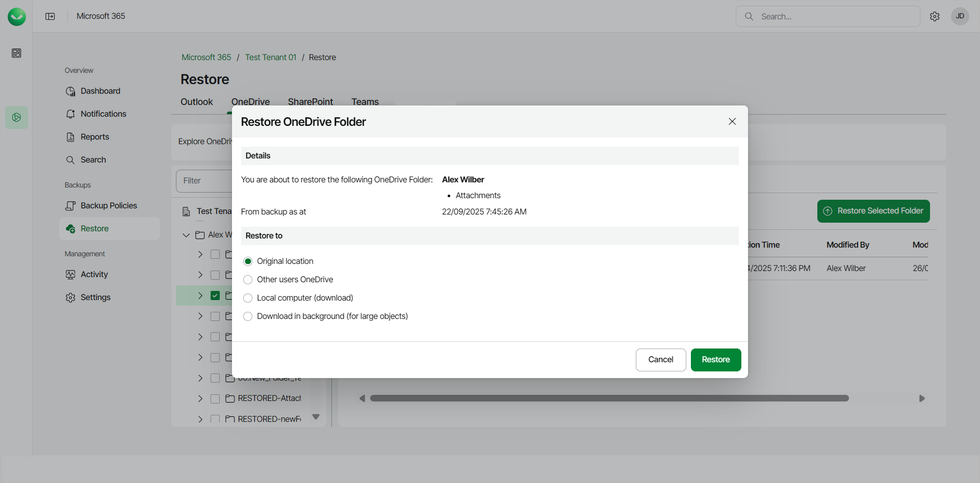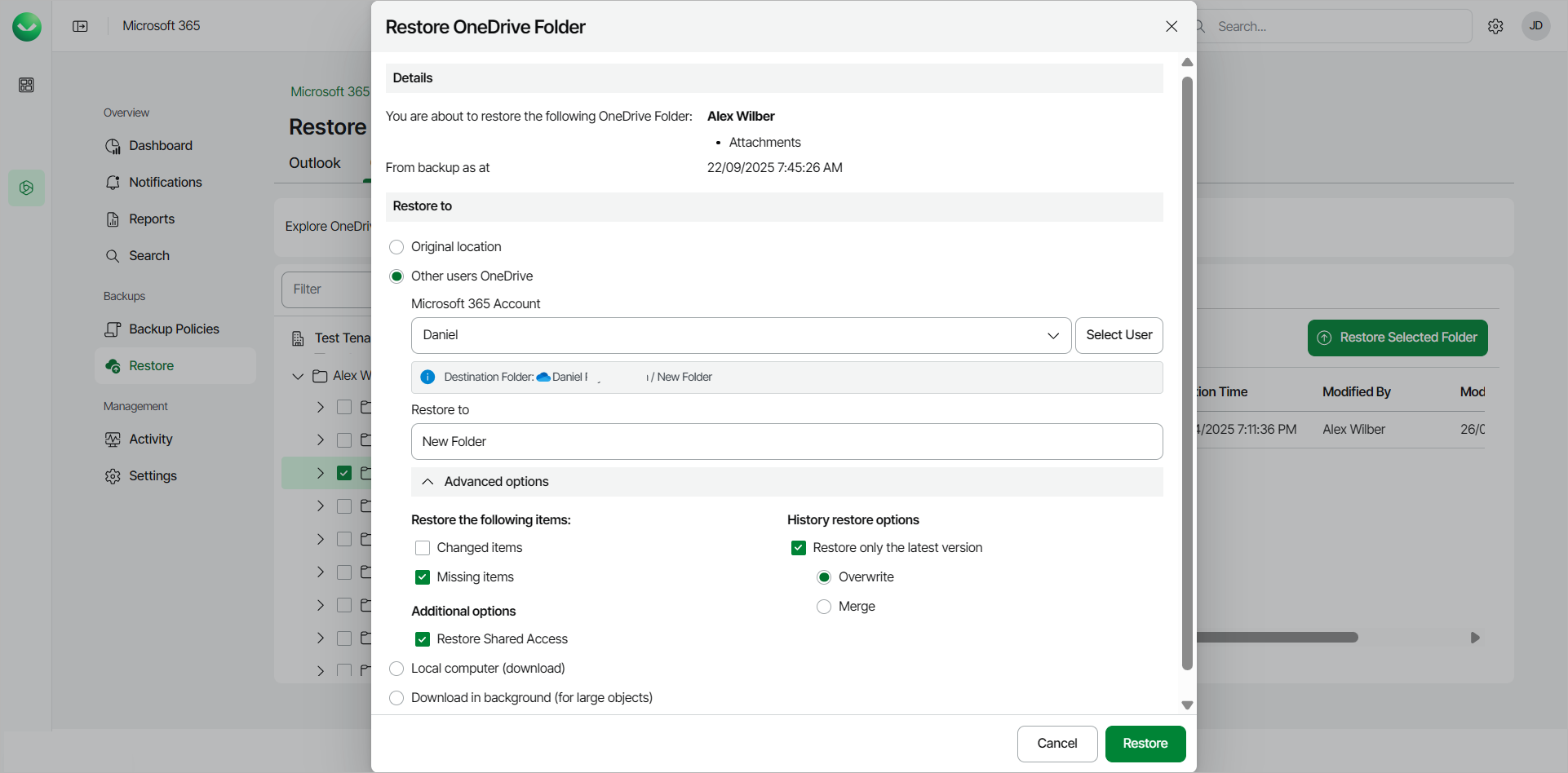 - Other users OneDrive. Select this option if you want to restore the OneDrive folder to OneDrive of another Microsoft 365 user.