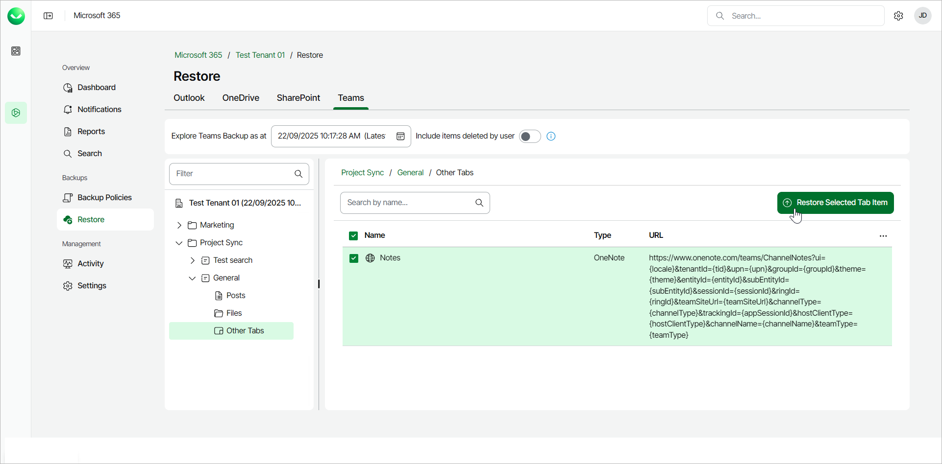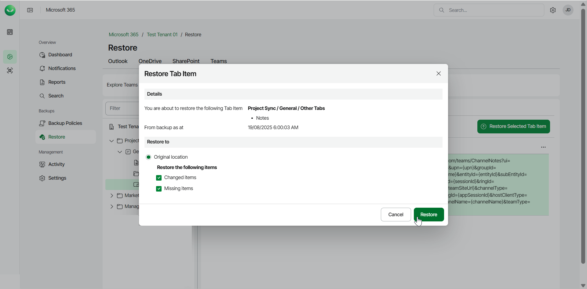- In the Restore Tab Item window, check the name of the team, channel and tab you want to restore, and the time when the backup was created.