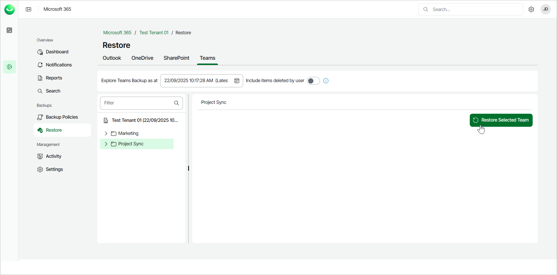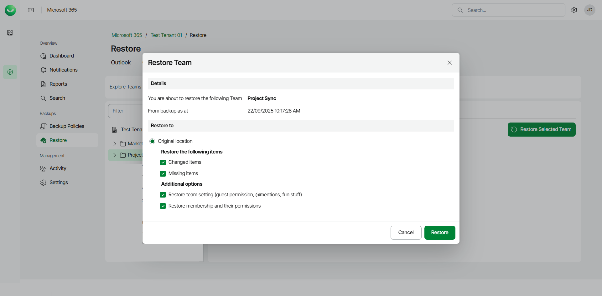 - In the Restore Team window, check the name of the team you want to restore and the time when the backup was created.