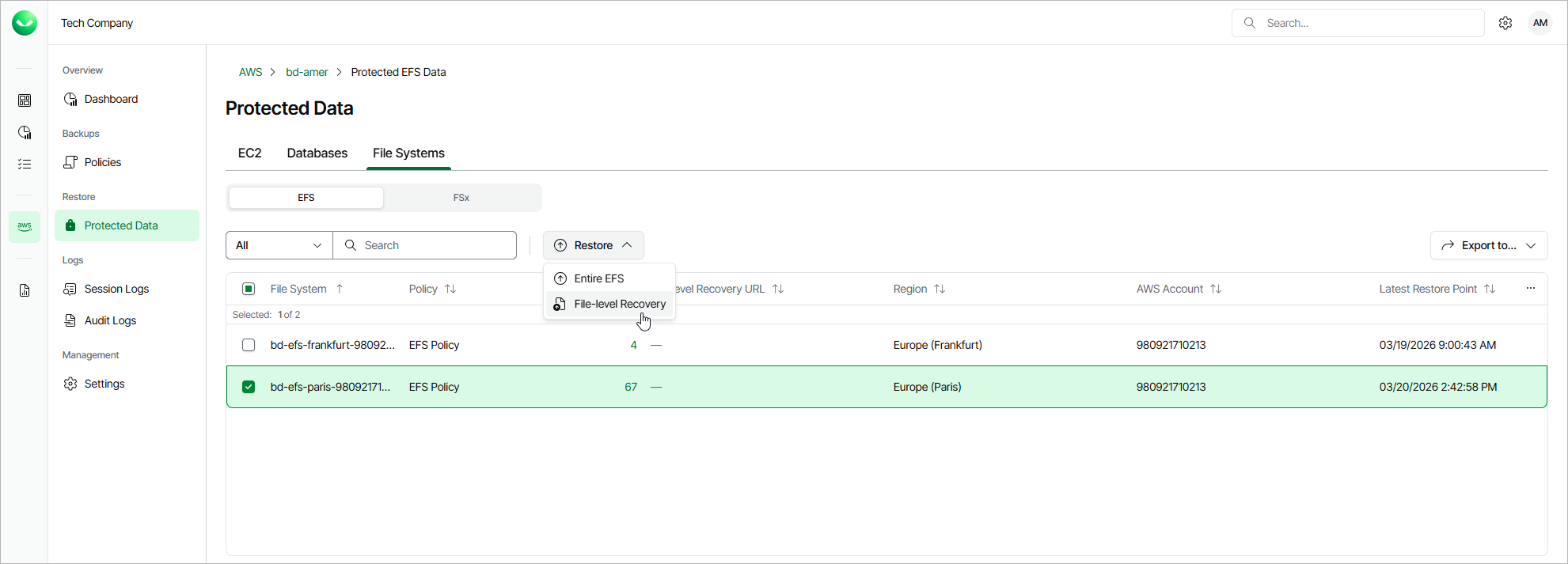 - On the tenant administration page, navigate to Protected Data > File Systems > EFS.