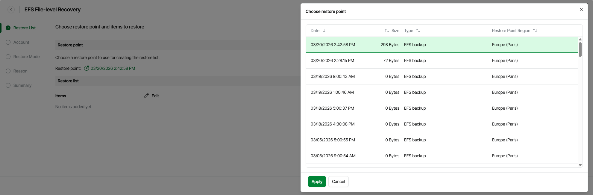 - Restore Point Region — an AWS Region where the restore point is stored.