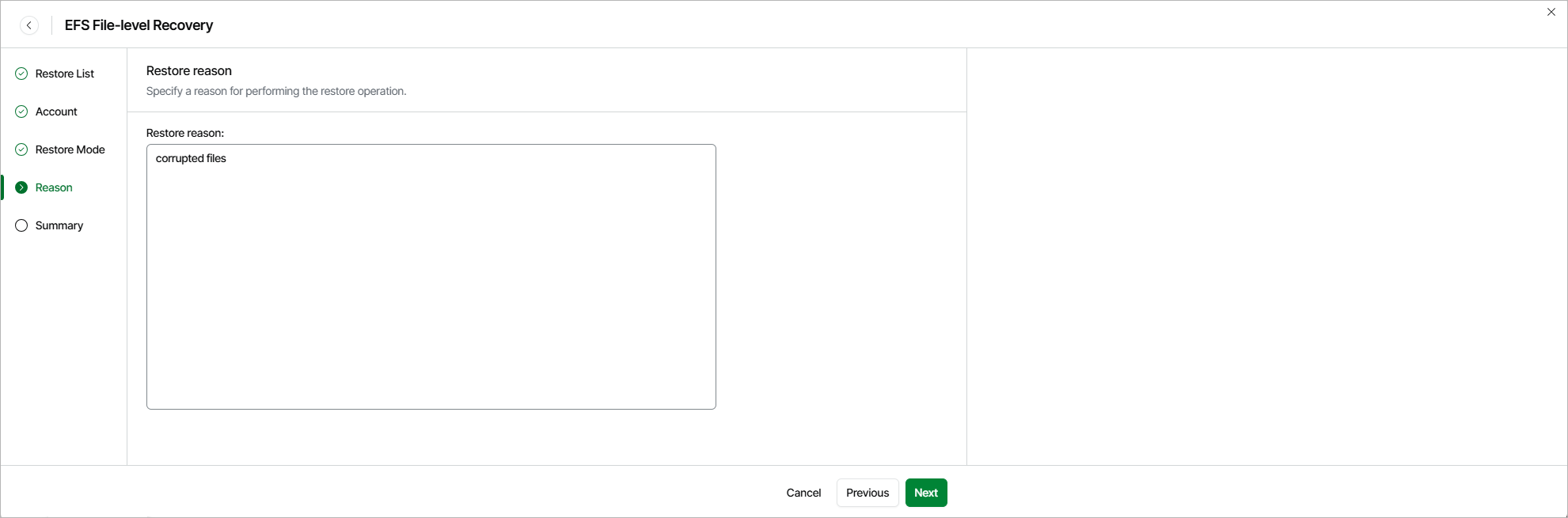 Step 5. Specify Restore Reason At the Reason step of the wizard, you can specify a reason for restoring the files and folders. The information you provide will be saved in the session history and you can reference it later.