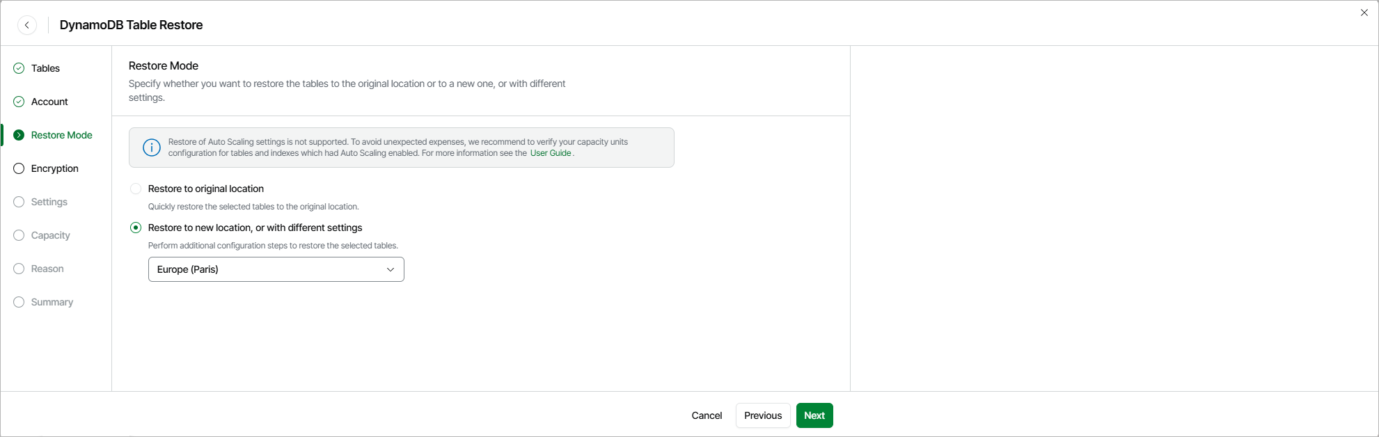 At the Restore Mode step of the wizard, choose whether you want to restore the selected DynamoDB table to the original or to a custom location. If you select the Restore to a new location, or with different settings option, specify the target AWS Region where the restored table will reside.