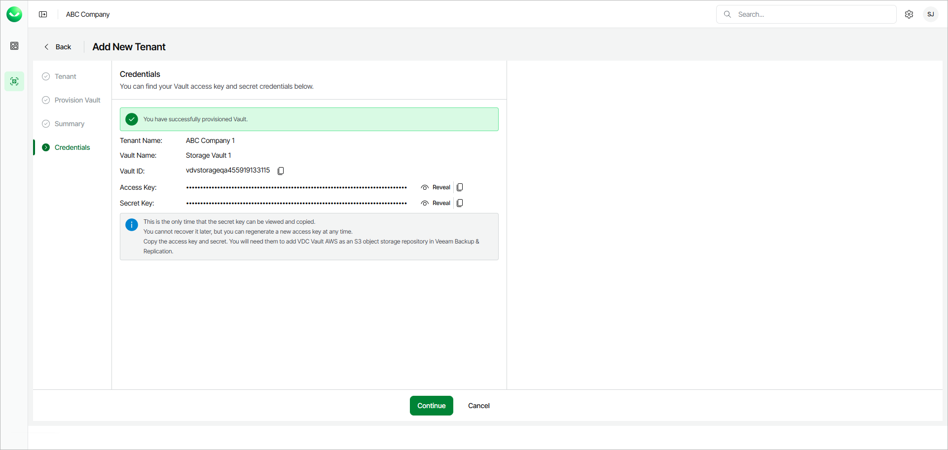 - [For AWS editions] At the Credentials step of the wizard, Veeam Data Cloud Vault will display the access key and secret key required to access the storage vault. You can use these keys to add Veeam Data Cloud Vault as an object storage repository in Veeam Backup & Replication.