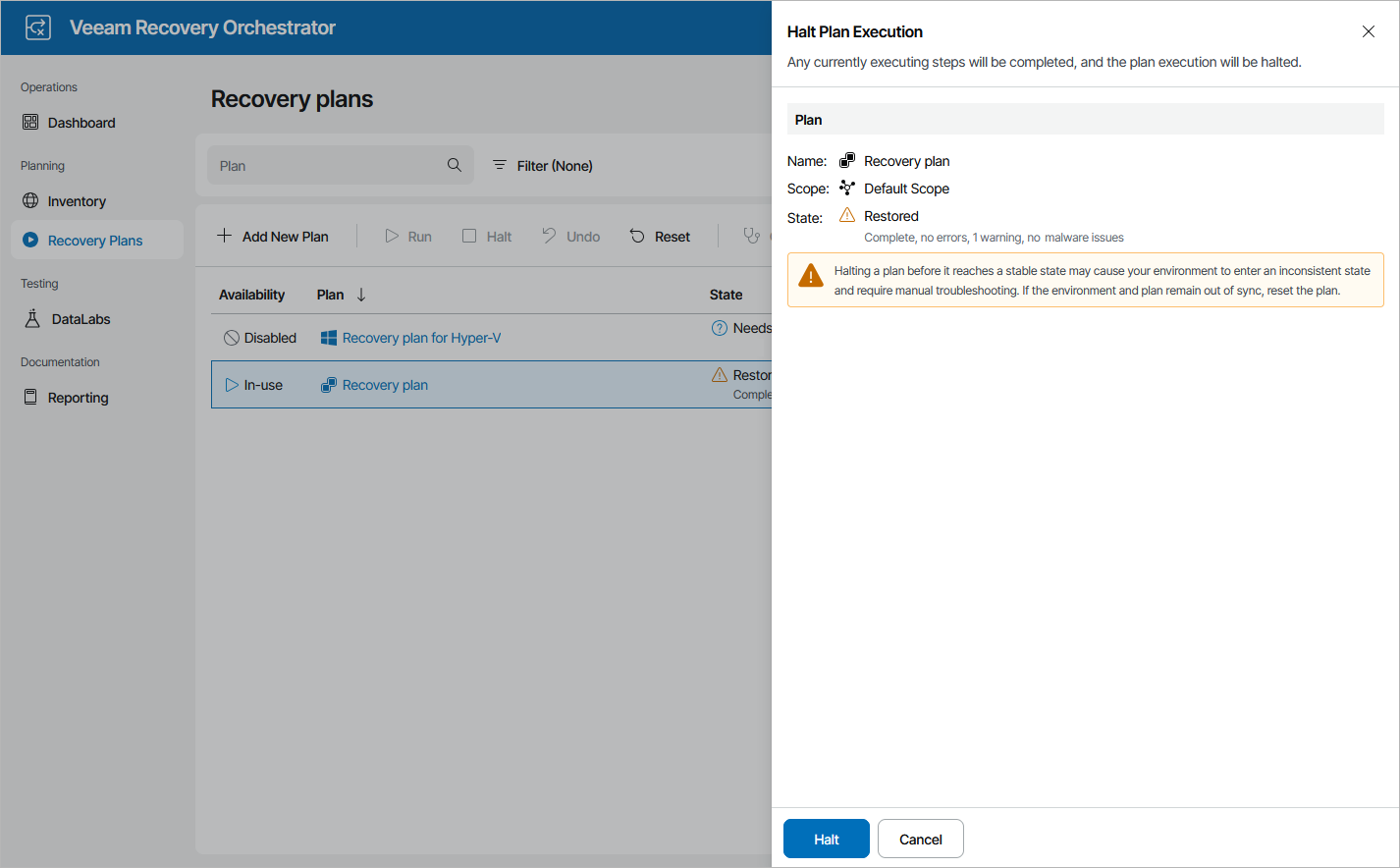 The Halt action interrupts plan execution. Any steps currently executing will be completed, then the plan will enter the HALTED state. To learn how to work with HALTED cloud plans, see Managing Halted Plans.