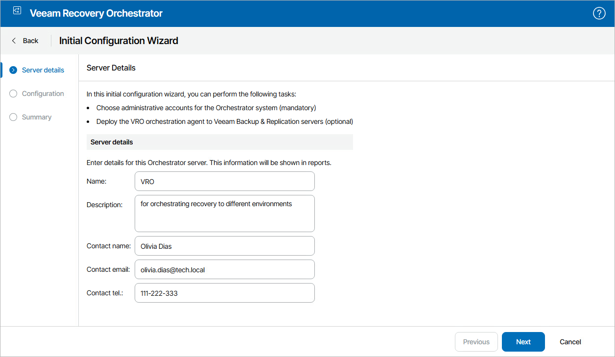 You can also provide a contact name, email and telephone number of a person or a group responsible for Orchestrator.