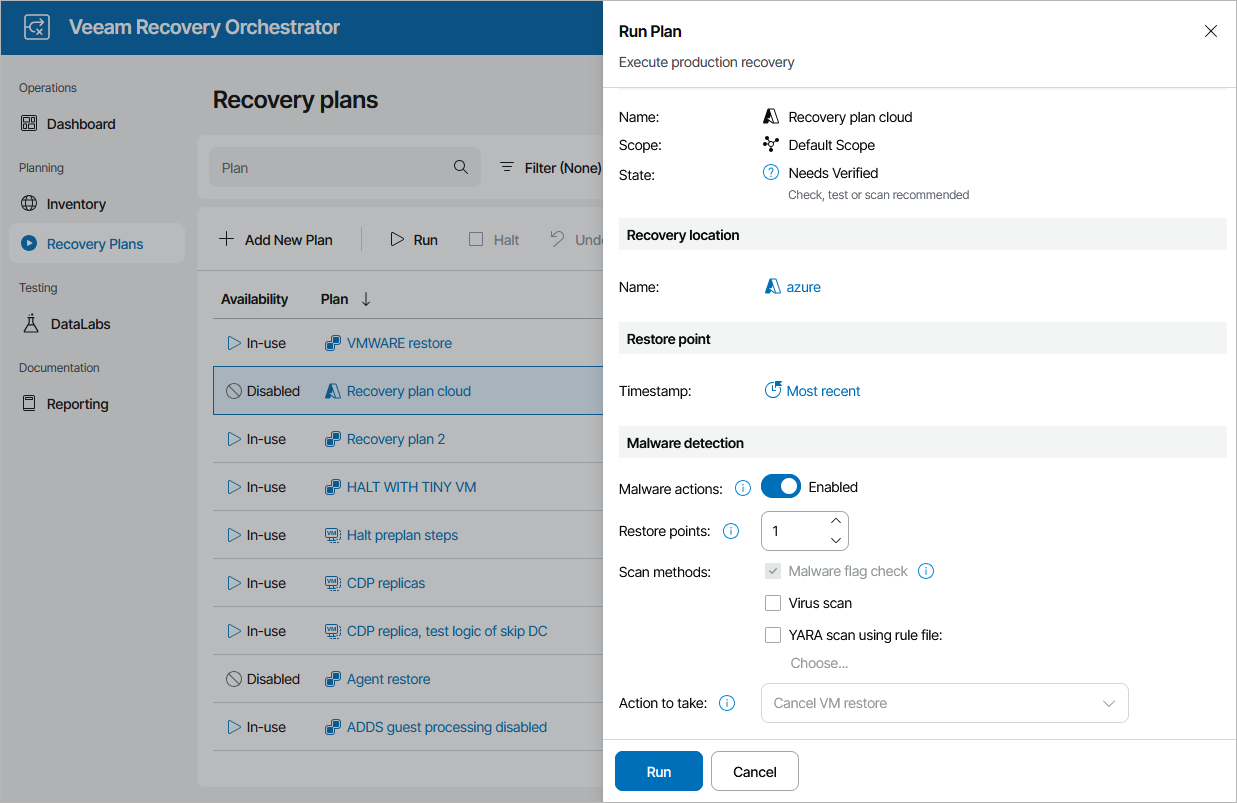 The Run action causes machines in a plan to recover from their backup files. For more information on the data recovery process, see the Veeam Backup & Replication User Guide, section Data Recovery.