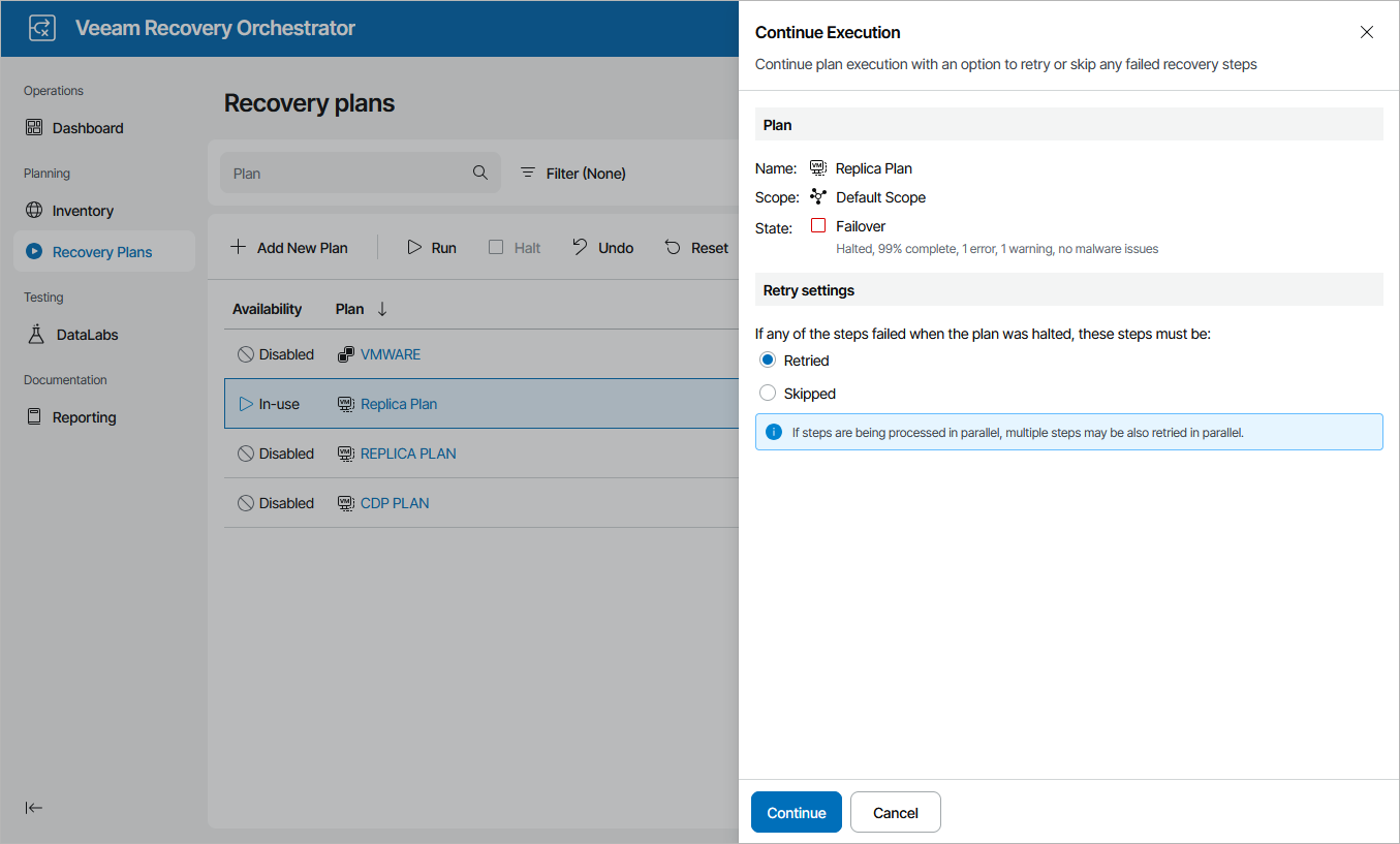 Choose whether you want to proceed with plan execution from the next plan step or to retry the failed step.