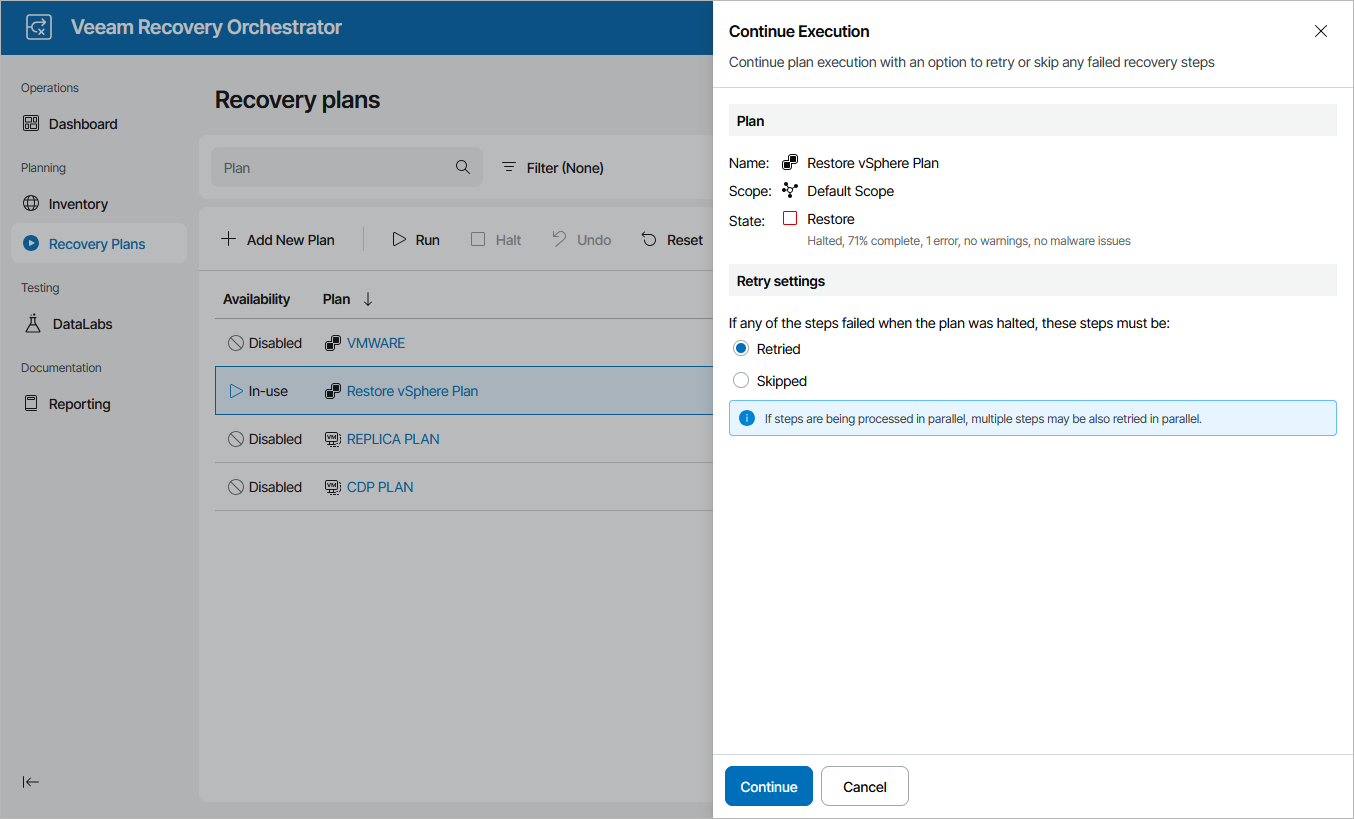 Choose whether you want to proceed with plan execution from the next plan step or to retry the failed step.