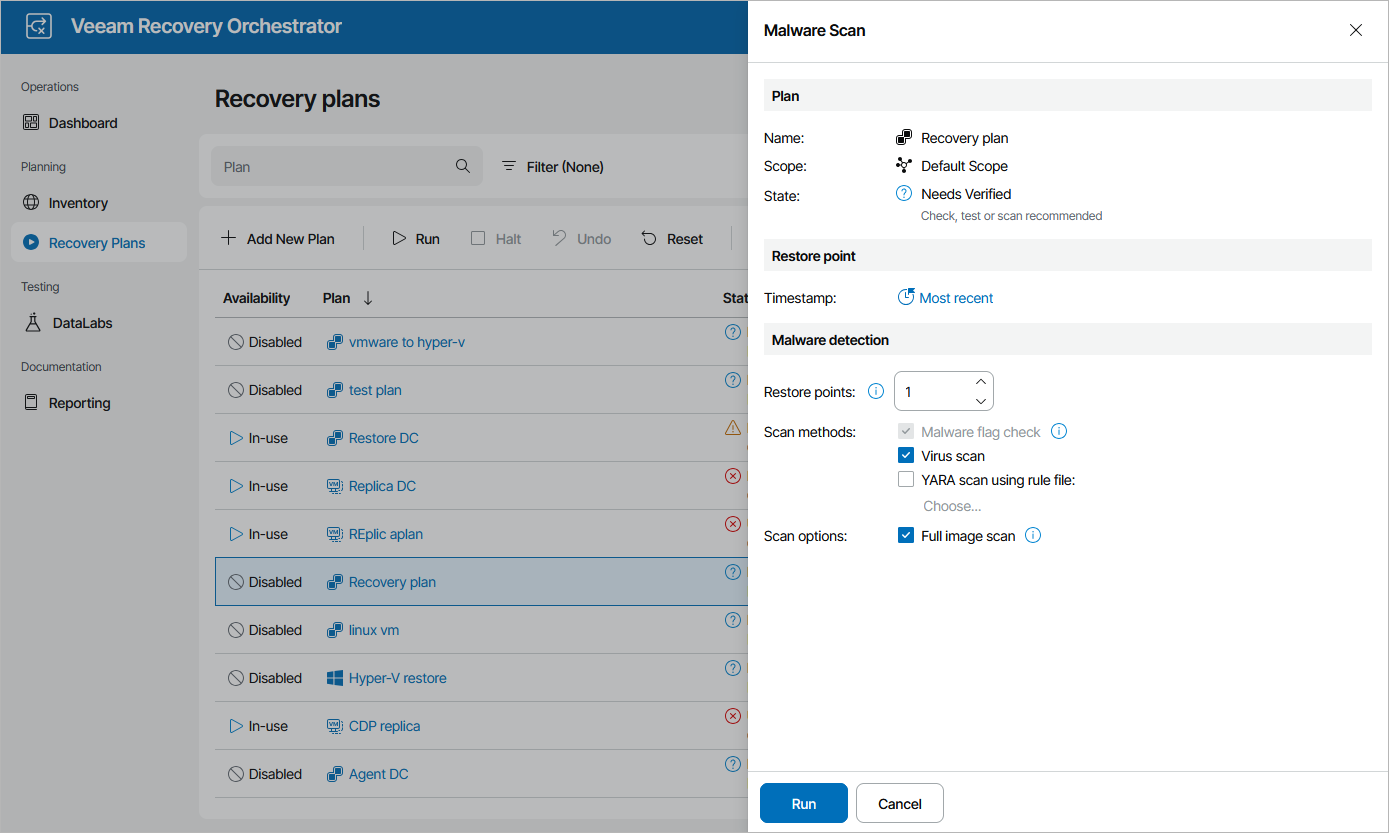 - [Applies only to restore and cloud plans] Decide whether you want to scan these restore points with antivirus software, YARA rules or both.