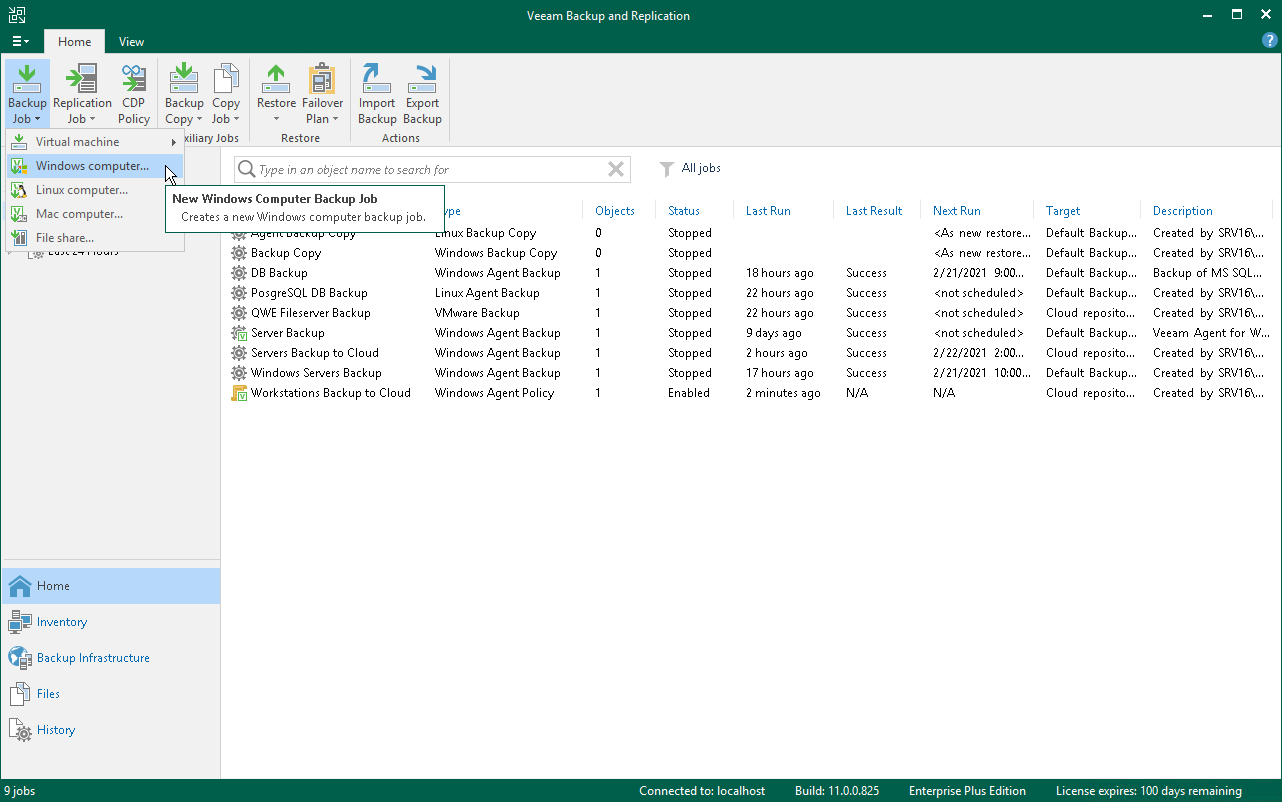 - Open the Home view. Select the Jobs node and click Backup Job > Windows computer on the ribbon.